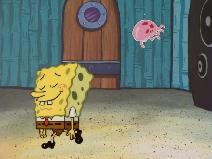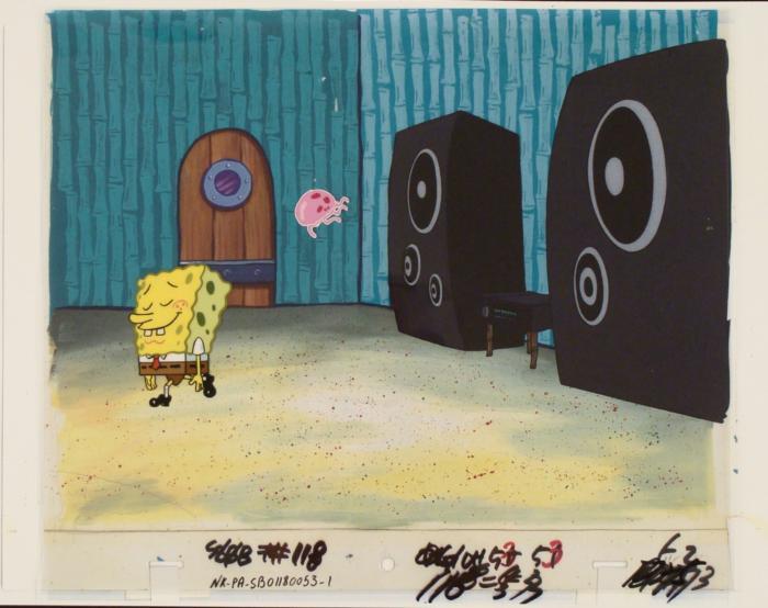 This animation cel and reproduction background are from the Nickelodeon TV show SpongeBob Squarepants. The story takes place under the deep blue sea in Bikini Bottom, where SpongeBob resides. SpongeBob, who is a yellow, porous sponge, is your typical happy-go-lucky character, as he is always cheerful and enjoys making people laugh. Patrick Star, SpongeBob's neighbor who is a starfish, is your average children's show idiot, as he boasts knowing nothing and is often getting himself into ridiculous situations. Between the homes of these two lies the home of the miserable Squidward, a squid, who is known for being grouchy and playing tricks on SpongeBob and Patrick. Both SpongeBob and Squidward work at the Krusty Krab, a fast food business run by the greedy money-loving Mr. Krabs, a crab, the arch rival of the evil, possibly misunderstood, Plankton. Another neighbor, Sandy Cheeks, an athletic squirrel who normally wears an astronaut's space suit, was introduced in "Tea at the Treedome." She spends most of her time inventing and experimenting. There is a jellyfish following SpongeBob.Original Printed Background and Animated Cel Overall Size of Background: 10 1/2" x 17" Overall Size of the Cel: 10 1/2" x 12 1/2" Very good condition This is an original hand-painted cel set-up used in the production of an episode of "SpongeBob SquarePants." Each one-of-a-kind set-up represents a slight change in position of the characters. When individually photographed and projected in rapid succession, the images appear to move.