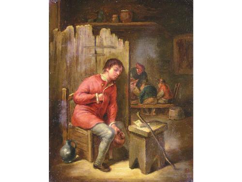 [Flemish 1605- 1638] UNTITLED (TAVERN INTERIOR-EAVESDROPPING); 16?? Oil on panel 10 x 8.25 ins. Signed & dated