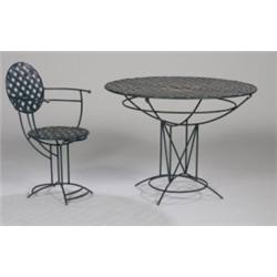 Designed circa 1940<BR>Table 39”diameter x 29.5”h; chairs 20”w x 20”d x 34.5”h<BR>