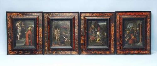 Follower of Lucas Cranach - 18th century German school. A fine set of four antique oil paintings on copper. Each depicting scenes from the trial and crucifiction of Jesus Christ. Each 10 5/8" x 7 1/2". 5000-6000 EA.