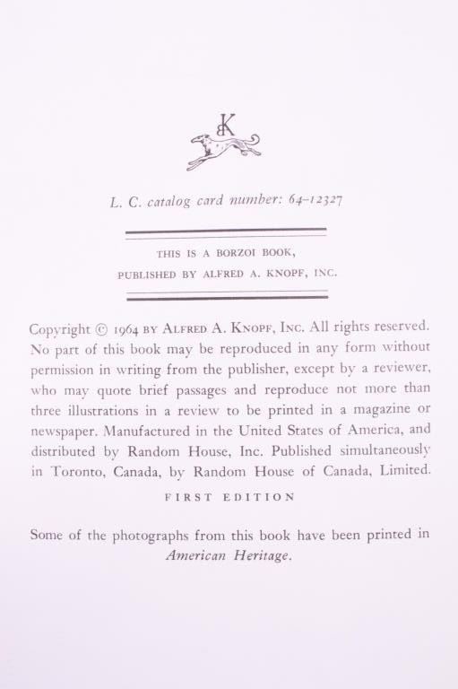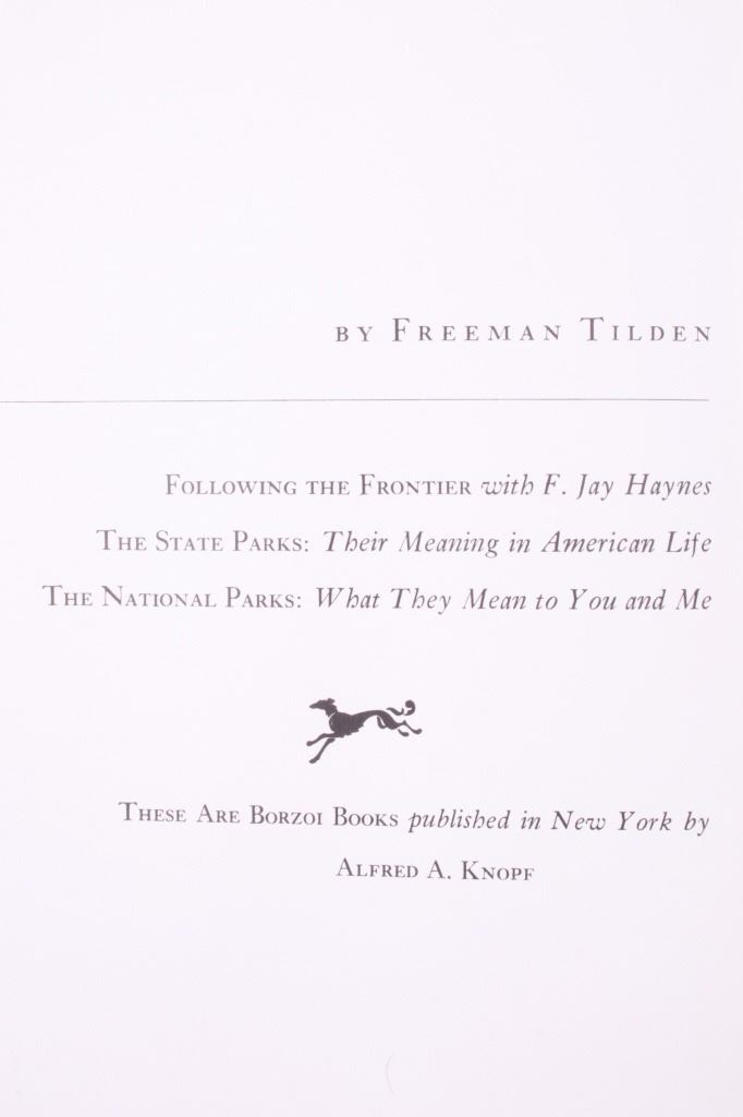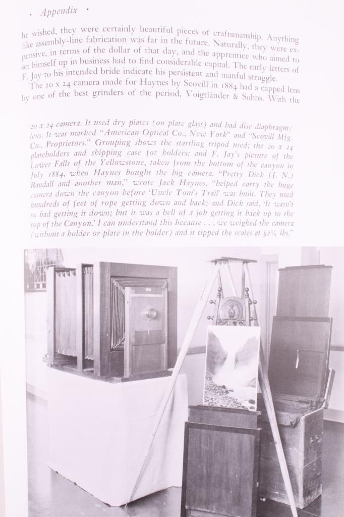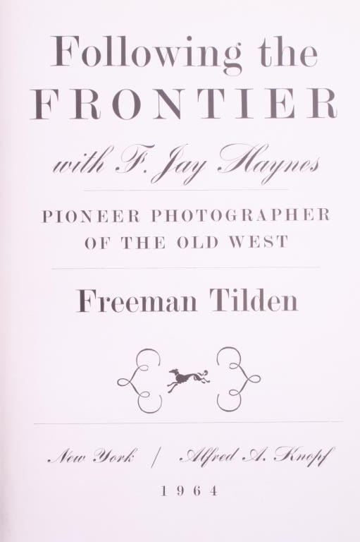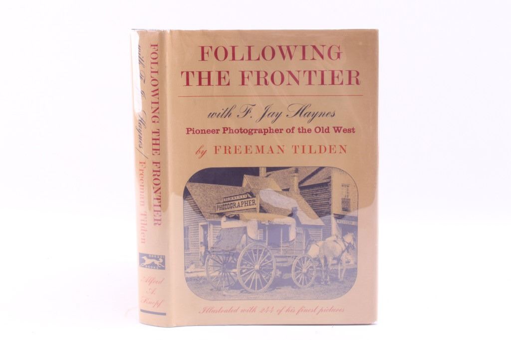 Offered in this lot is a 1964 first edition of “Following the Frontier with F. Jay Haynes Pioneer Photographer of the Old West” by Freeman Tilden. The book has its original un-clipped dust jacket. The book tells of F. Jay Haynes documenting of the west in his amazing photographs. Haynes was the modern promoter of the west and the young Yellowstone National Park with his photographs. This book contains 244 of his finest pictures. The book is in like-new condition and measures 10 1/4" x 7 1/2" x 1 1/4".