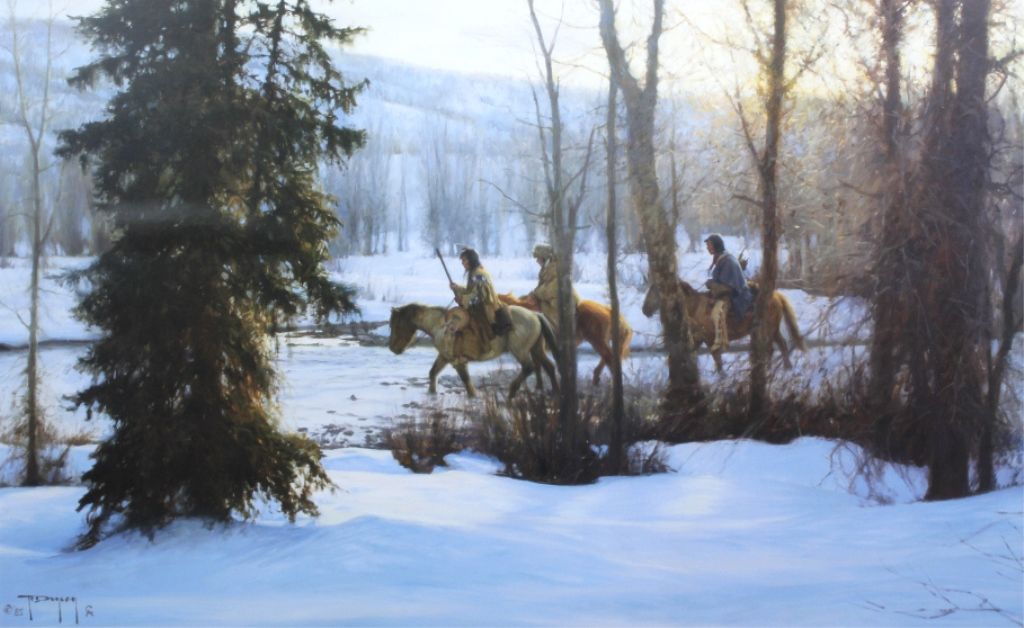 This is a print done by Robert Duncan and professionally matted and framed. Robert Duncan is a growingly collectible artist in the western art arena. His works hang in the most prominent western galleries and the original that this print is from exceeded $80,000 at auction. This is a great decor print from a notable artist. The piece shows three Native American's on horseback crossing the river. The frame measures 31”x43” and the artwork is 19.75”x31.5"