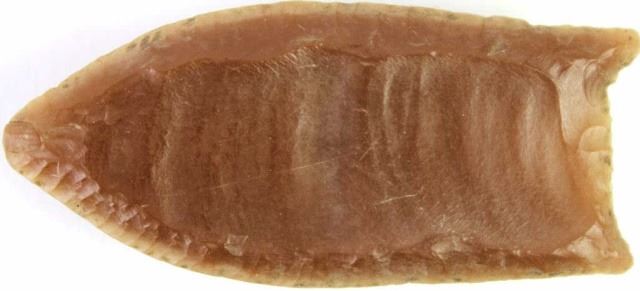 Folsom point showing full flute1 7/8" X 13/16". From Jerome Klingfus collection with NO coa, known provenance, or age.