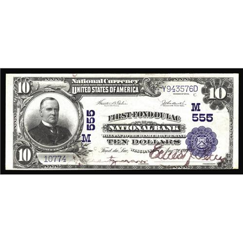 <B>Fond Du Lac, WI</B></I> - $10 1902 Plain Back Fr. 632 <B>First-Fond Du Lac NB</B></I> Ch. # (M)555<BR>While this is not an especially scarce bank, only a tiny handful of the known Third Charter examples are as nice looking as this <B>Extremely Fine</B></I> $10 Plain Back. This note bears the second of two titles under which this institution issued, with all of its Plain Backs displaying this name.