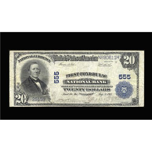 <B>Fond Du Lac, WI</B></I> - $20 1902 Plain Back Fr. 658 <B>First-Fond Du Lac NB</B></I> Ch. # 555<BR>The signatures of J.L. Gormican and Ernst J. Perry are faded on this snappy <B>Fine+</B></I> $20 from the second title of this bank.