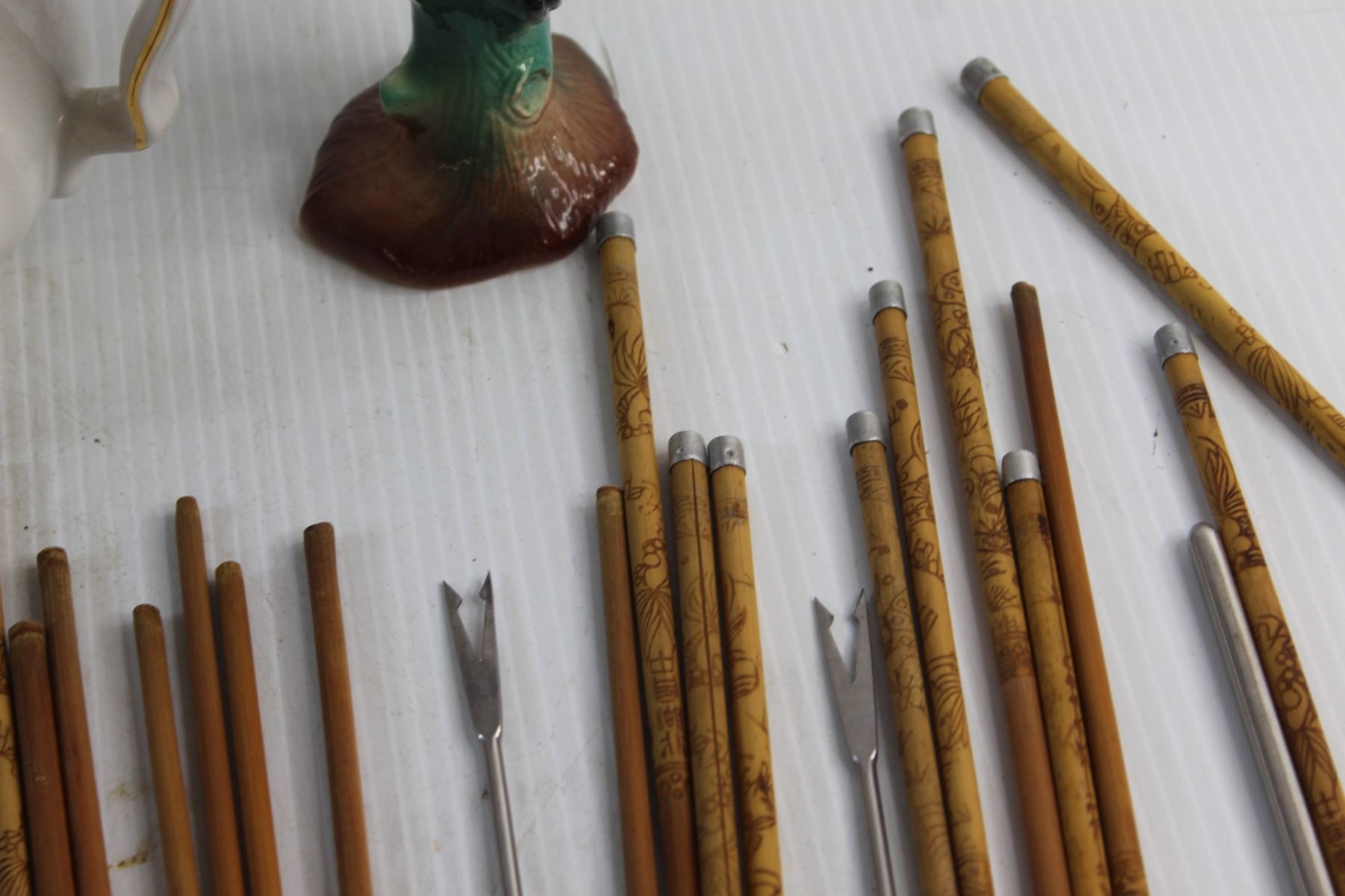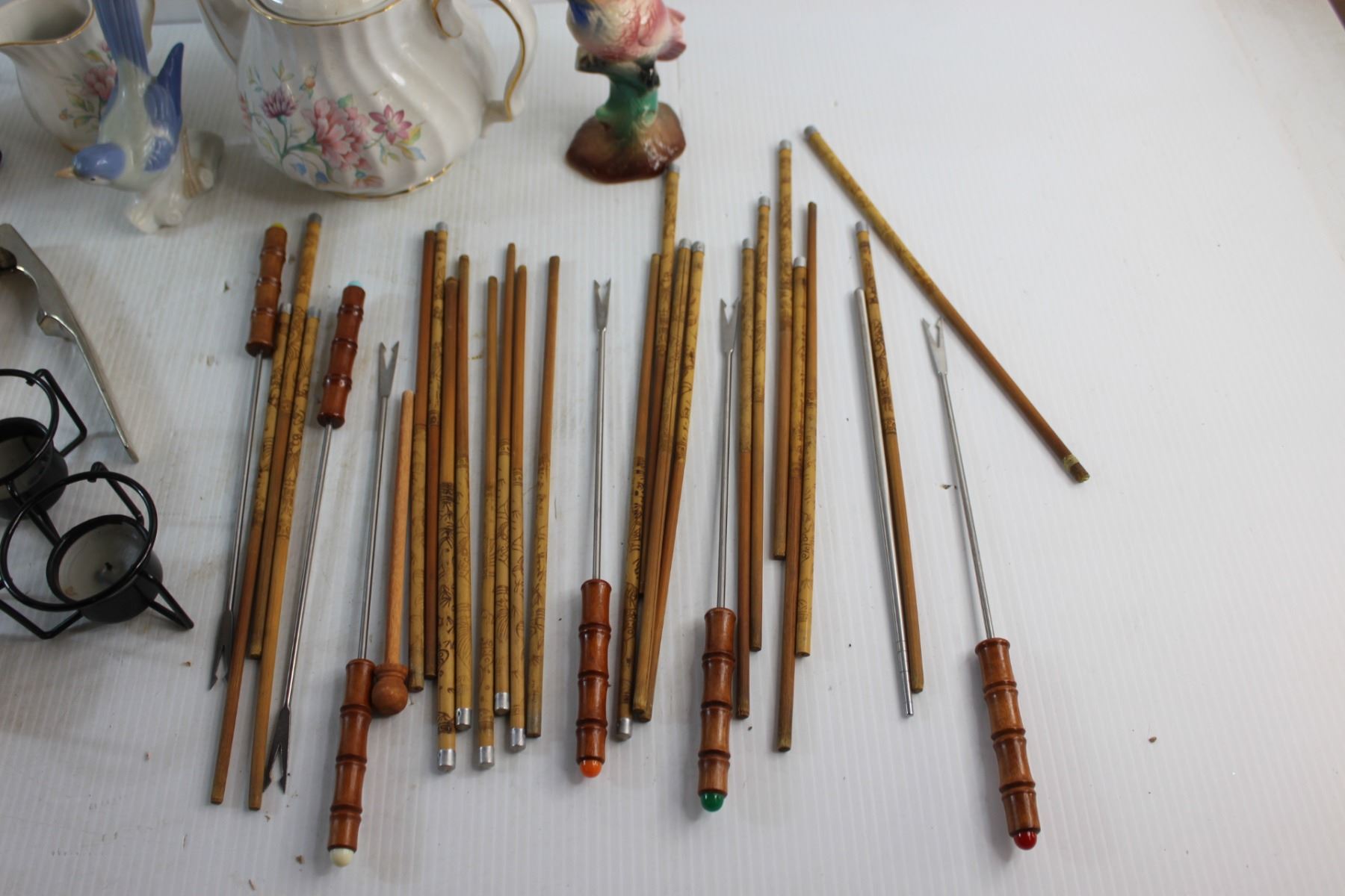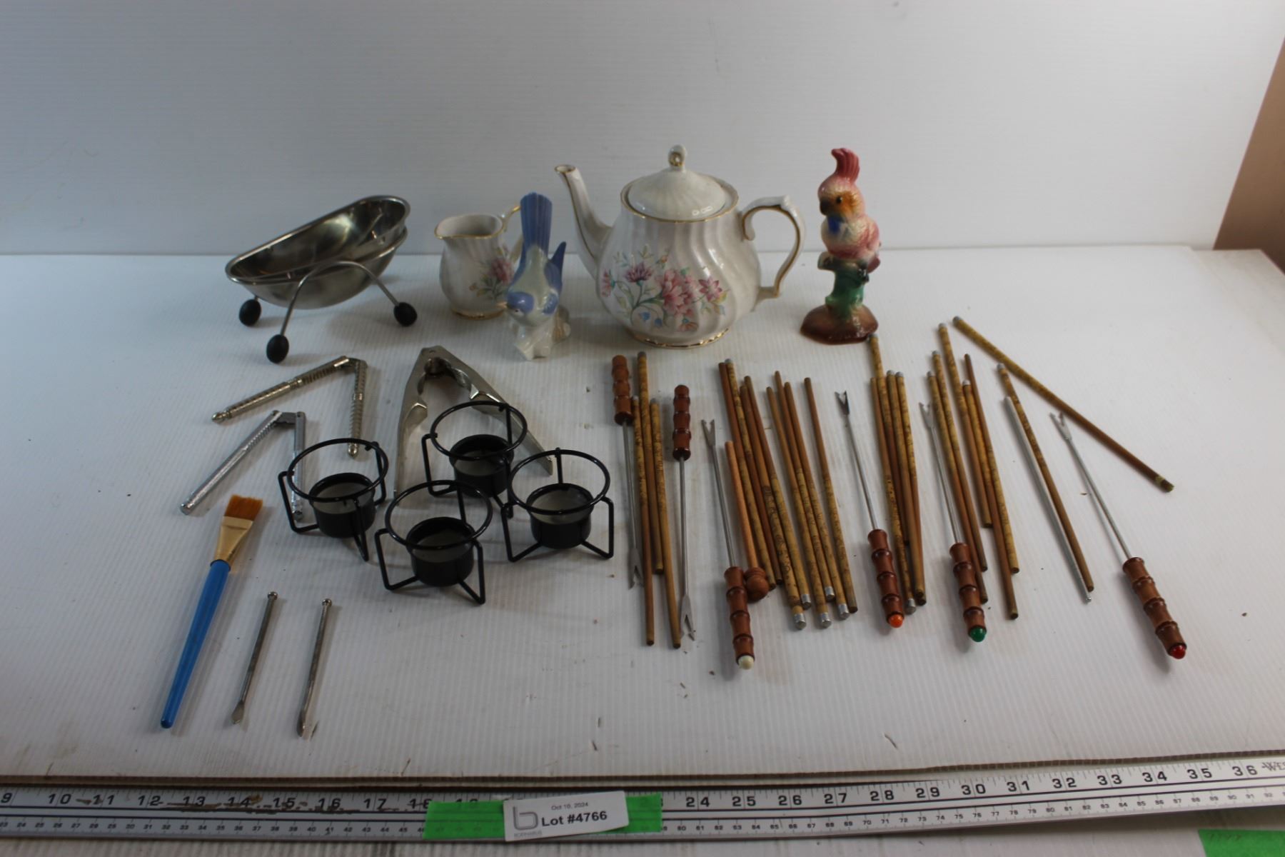 Fondue Sticks, Candle Holders, Tea Pot, Creamer, Nutcrackers and Assorted Items