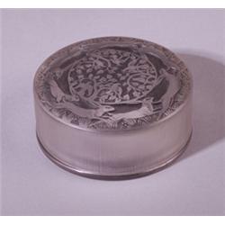 "Fontainebleau," a LALIQUE box, circa 1921, in clear and frosted glass with gray patina. Molded R. LALIQUE. M p. 233, no. 59. 8.5 dia.