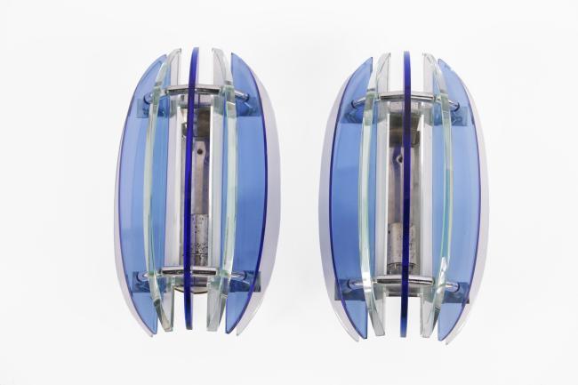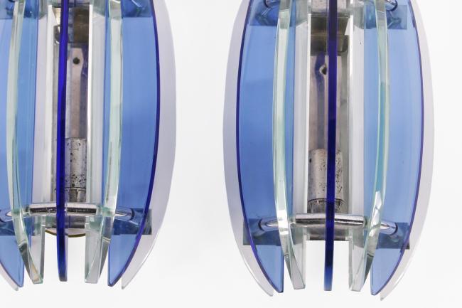 11h x 6w x 3.5d inches, clear and blue glas panels, chorme plated metal base, perfect