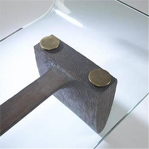 Fontana Arte<BR>coffee table<BR>Italy, 1950s<BR>glass, carved oak, brass<BR>38.5"w x 17.75"d x 15.25"h<BR>Provenance: B.C. Holland, Chicago<BR>Private collection<BR><BR><BR><BR><BR>