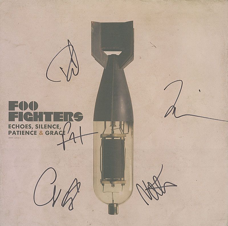 Echoes, Silence, Patience & Grace album signed on the front cover in black felt tip by Dave Grohl, Pat Smear, Nate Mendel, Taylor Hawkins, and Chris Shiflett, all signing first names only. In fine condition. The record is not included. Accompanied by a full letter of authenticity from PSA/DNA and a full letter of authenticity from Roger Epperson/REAL.