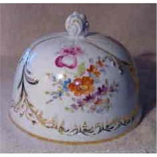 Beautiful Victorian Food Cover. No marks. Three handpainted floral designs. Heavy gilding. Unglazed rim where it sat in the kiln. 6.3/4" diameter. 6.1/2" tall. Samson type decoration. Circa 1900