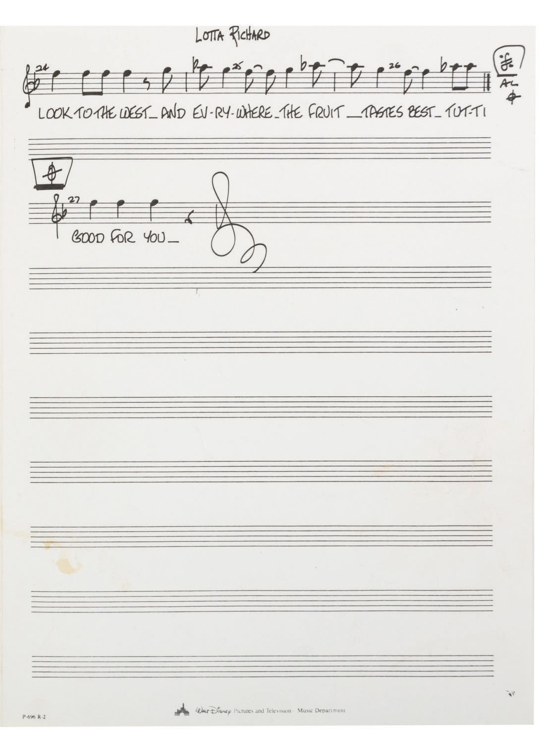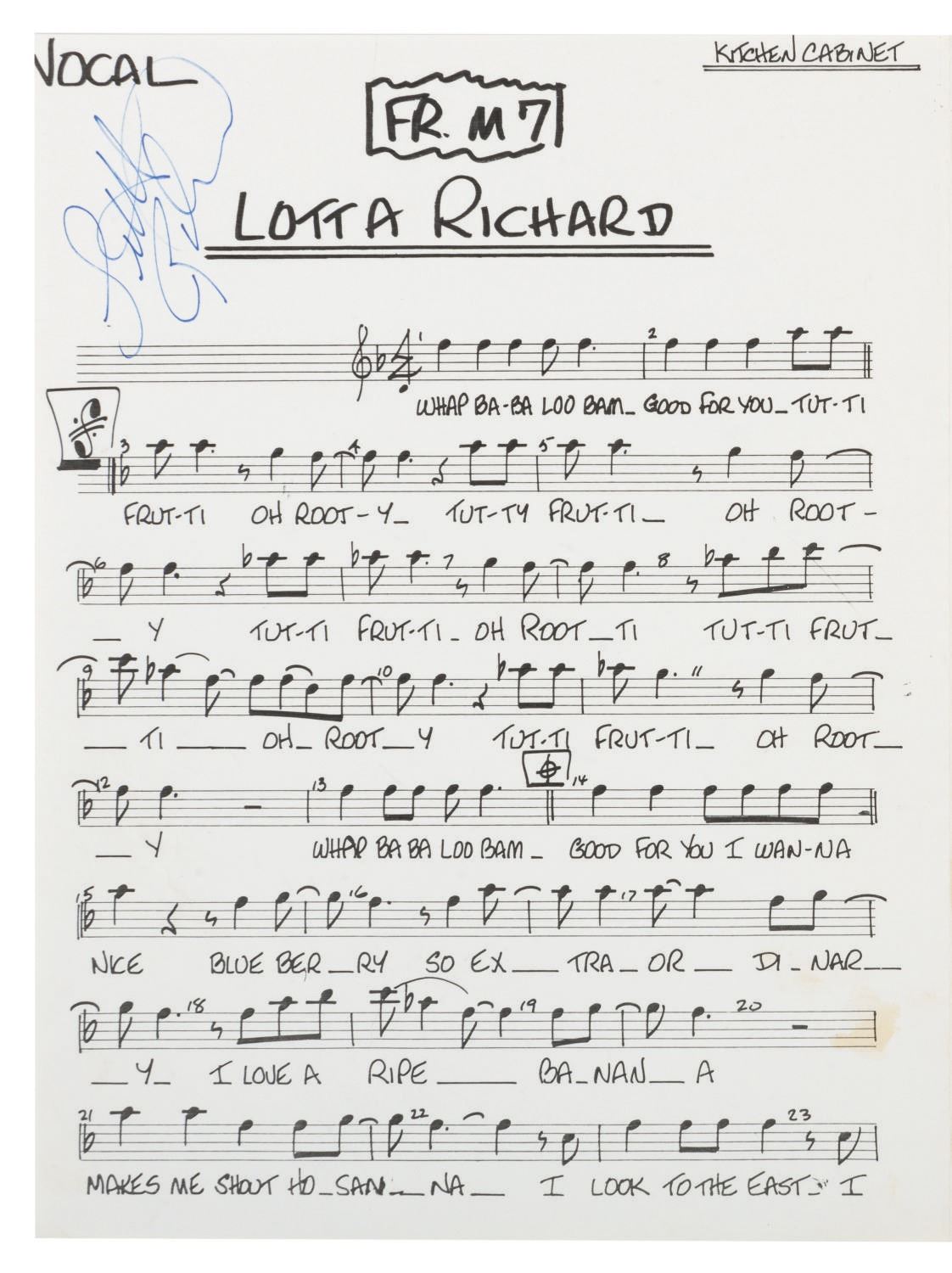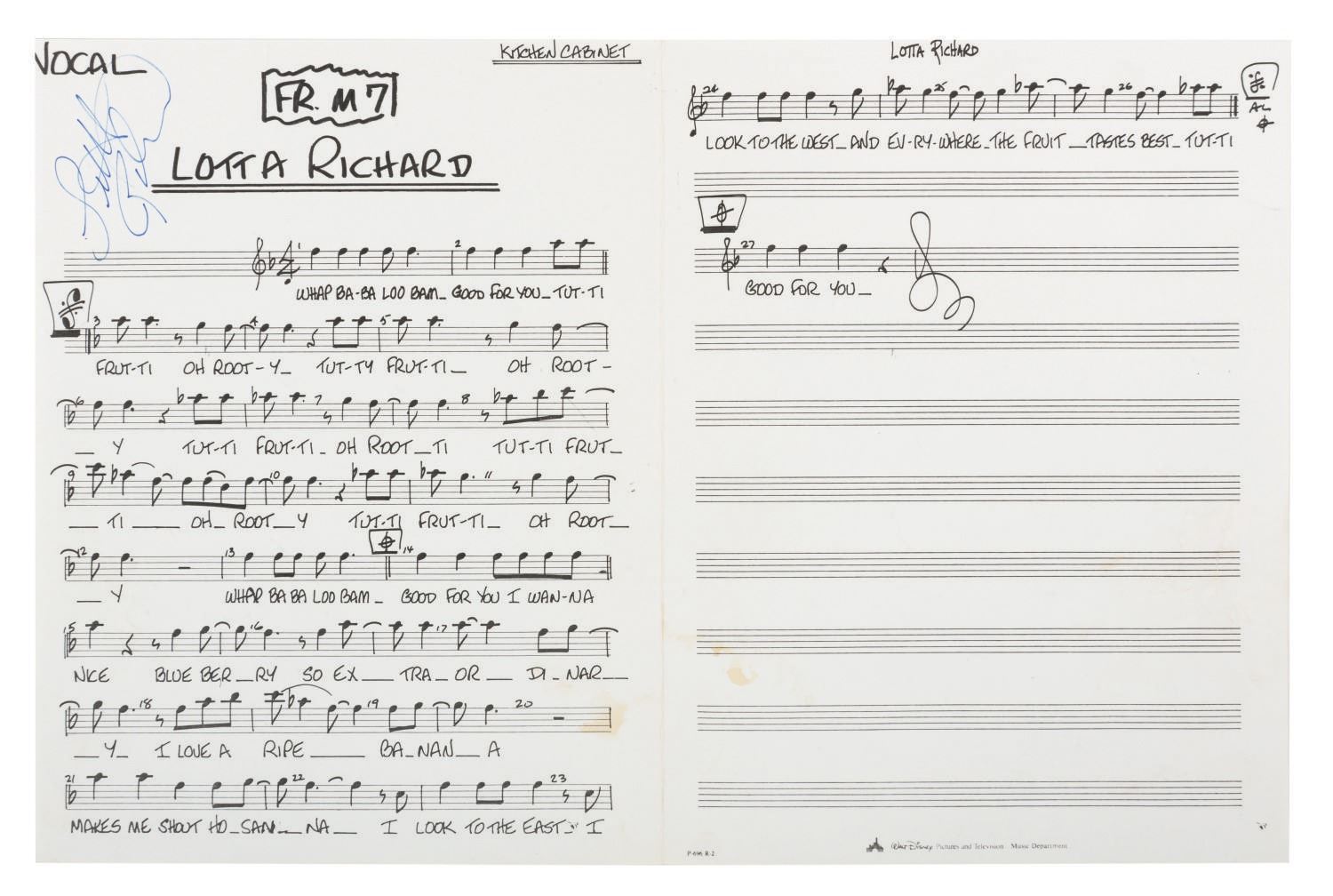 (Epcot, 1994) A two page printed sheet of music for the vocals on "Lotta Richard" (a parody of Little Richard's Tutti Frutti) from the Food Rocks show at Epcot. The character voices throughout the show were performed by notable popular vocalists and this music has been signed by Little Richard who provided the vocals on this track. Used during the recording of the track, the folded sheet music Measures 9.5"x12.5" and is in fine condition, despite mild staining, and slight wear to edges and corners.