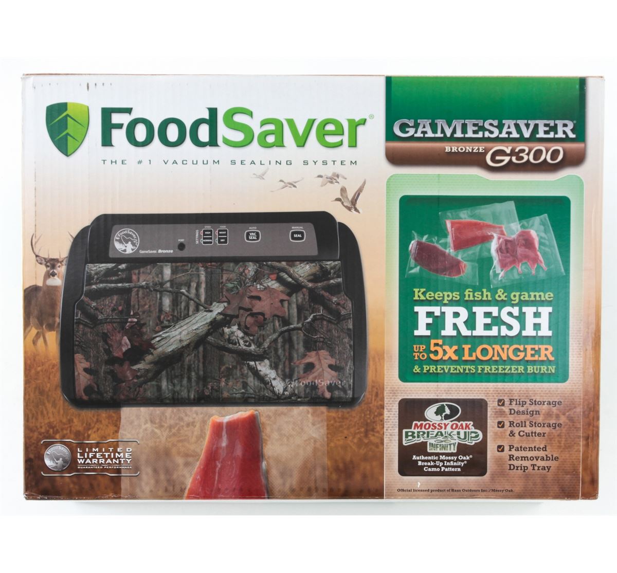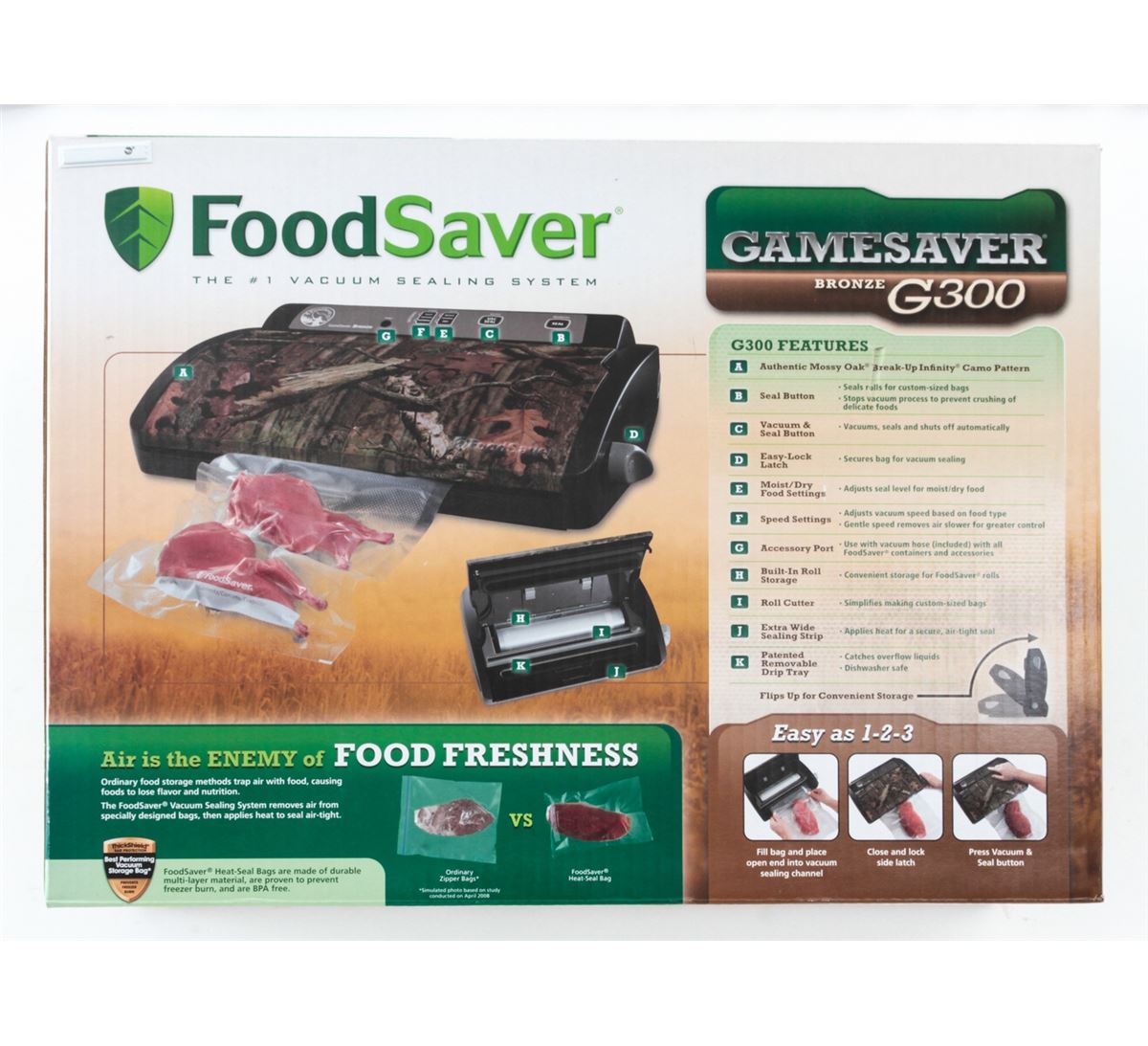 FoodSaver G300 Vacuum Packaging System, designed for heavy-duty repetitive use. Includes GameSaver silver appliance, FoodSaver rolls and bags, 12 volt DC adapter cord, accessory hose/hose storage. Brand new in original packaging. Retails @ $169.95. Est.: $100-$150. (Field Time)