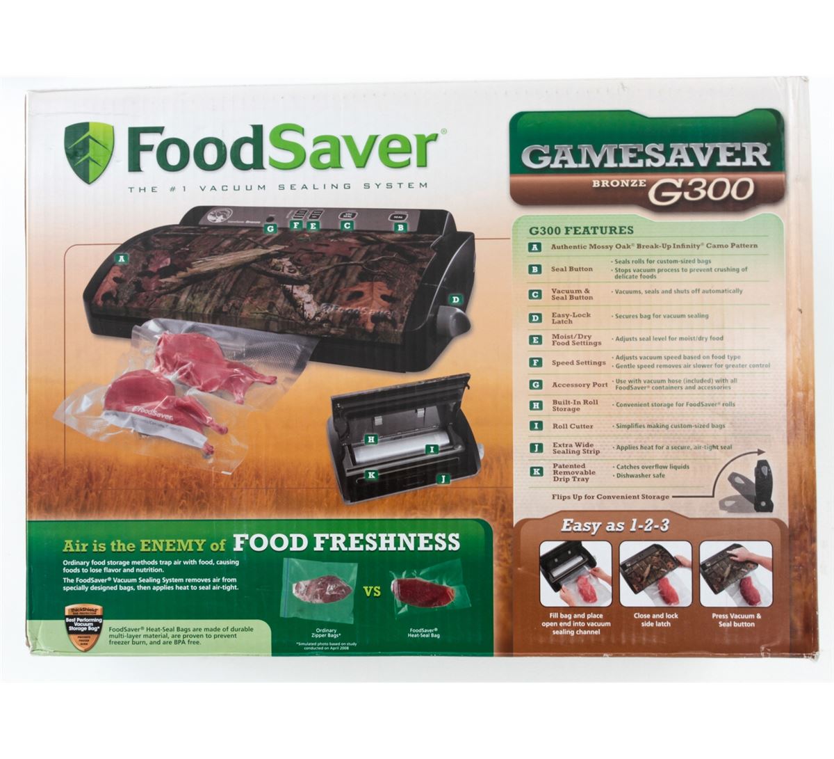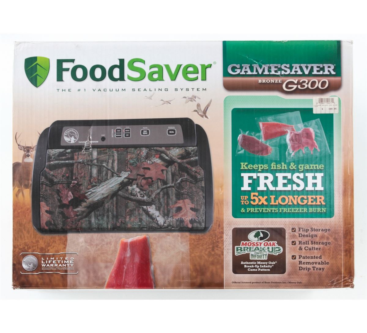 FoodSaver G300 Vacuum Packaging System, designed for heavy-duty repetitive use. Includes GameSaver silver appliance, FoodSaver rolls and bags, 12 volt DC adapter cord, accessory hose/hose storage. Brand new in original packaging. Retails @ $169.95. Est.: $100-$150. (Field Time)