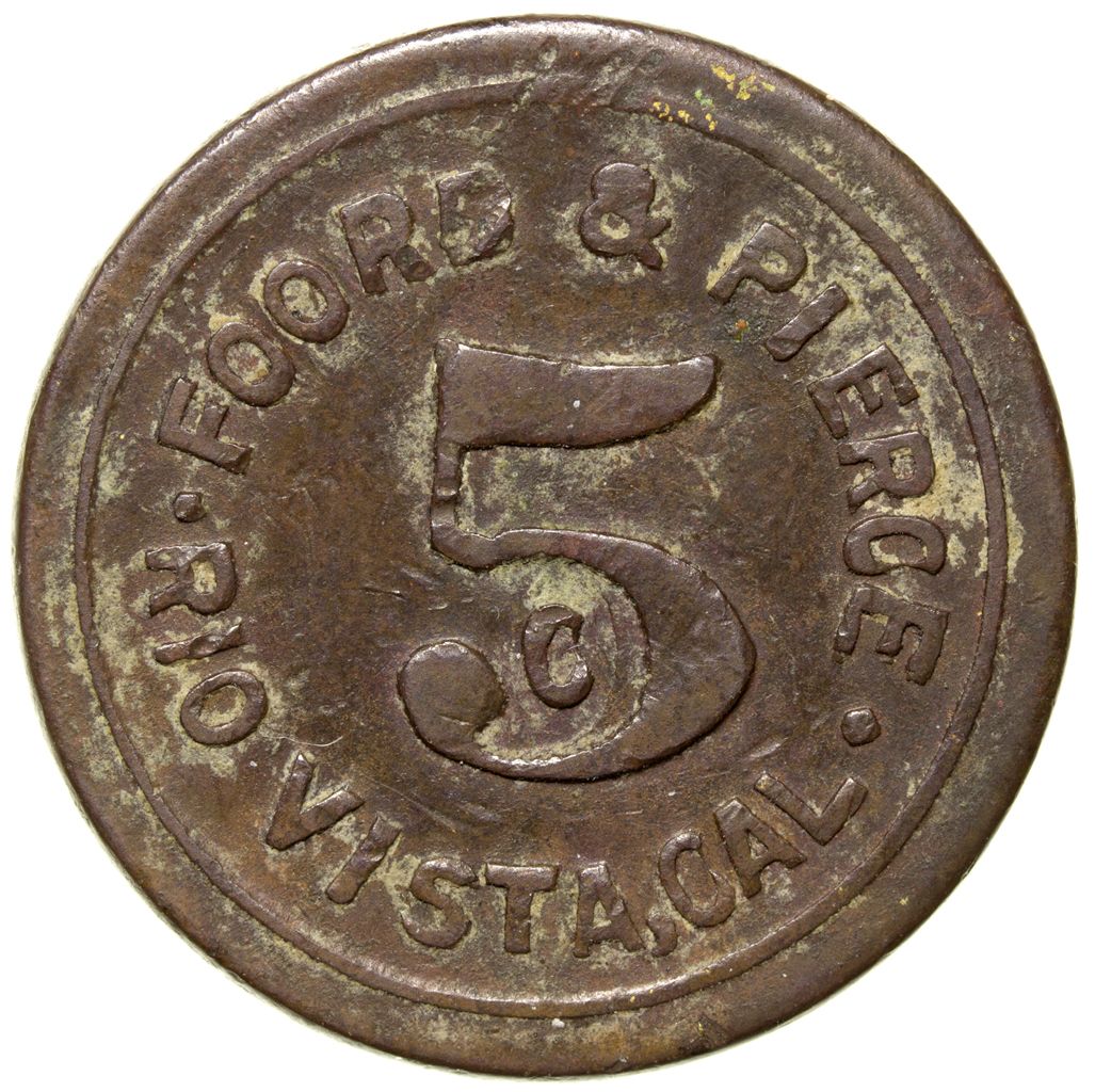 Obv.: Foord & Pierce / 5c / Rio Vista, Cal.; rev.: blank. Br., rd., 21mm, EF condition. -60602