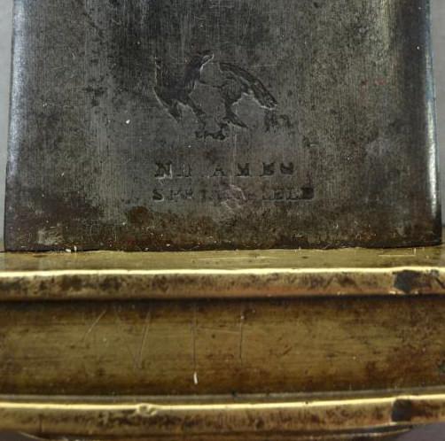 ricasso marked "United States 1835", "N.J. Ames" to reverse, hilt end of handle shows inspectors stamp "HKC". Blade shows clean silver gray patina, moderate surface erosion, heaviest at tip. Blade 19", 25" overall.