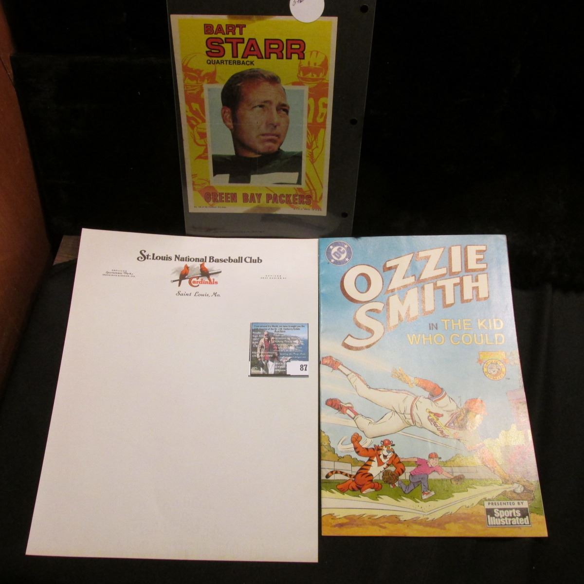 Foot ball Pin up of "Bart Starr Quarterback Green Bay Packers"; "Ozzie Smith in The Kid Who Could" DC comics; and stationery "St.Louis National Baseball Club Cardinals".