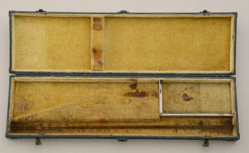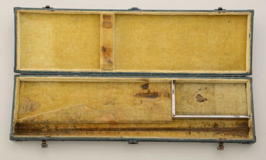 Foot locker style partitioned heavy steel gun case for a SxS shotgun in overall good condition showing riveted construction with three latches and brass carry handle; case is painted green and shows considerable paintremaining. Est.: $50-$100.