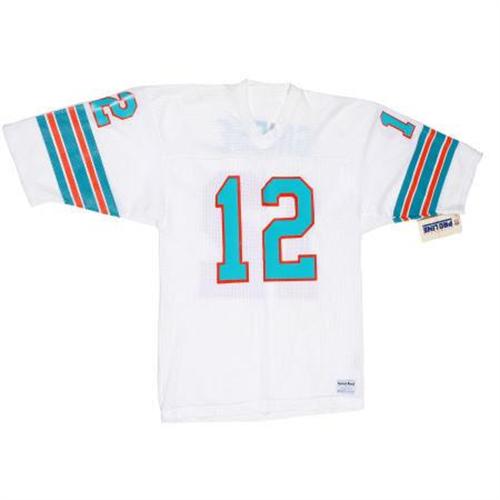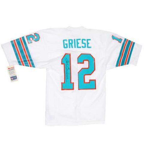 <B>Bob Griese Signed Jersey.</B></I> A member of the College Football H.O.F. and Pro Football H.O.F., Bob Griese was also a two time All-American. We offer you here a White MacGregor NFL Pro Line Authentic size Large Bob Griese Dolphins jersey, which is signed on the rear numerals. <I>LOA from PSA/DNA.</B></I><BR><BR><b>Shipping:</b> Clothing, Costumes & Jerseys (<a target="_blank" href="http://www.heritageauctions.com/common/shipping.php">view shipping information</a>)