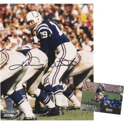 <B>Johnny Unitas Single Signed Photo and Lenny Moore Single Signed Sports Card Lot of 2.</B></I> Two of the greatest Colts and members of the Hall of Fame, Johnny Unitas and Lenny Moore are included in this lot. Quarterback Johnny Unitas added his signature to the 8x10" color photograph in black sharpie and Lennie Moore added his blue sharpie signature to the front his Upper Deck card.<BR><BR><b>Shipping:</b> Flat Material, Small (<a target="_blank" href="http://www.heritageauctions.com/common/shipping.php">view shipping information</a>)