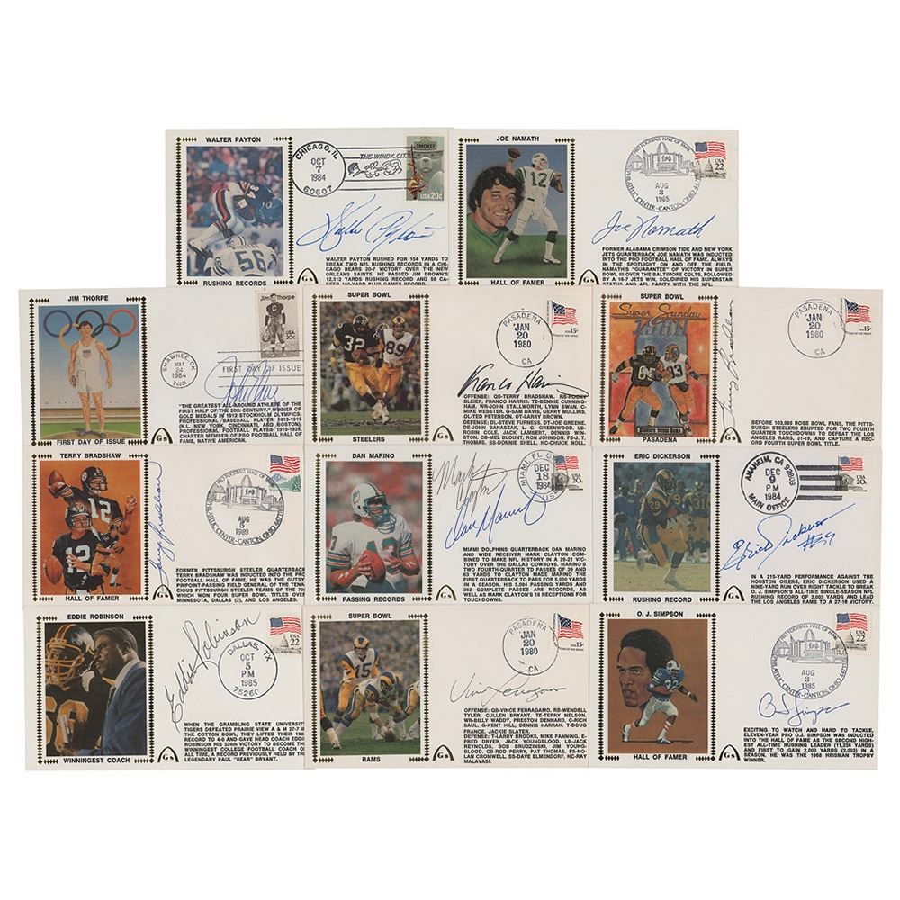 Eleven Gateway covers with silk color cachets honoring football greats and events, each signed in ink by one or more legends. Signers are: Walter Payton, Joe Namath, Eric Dickerson, John Elway, Terry Bradshaw (2), Franco Harris, Dan Marino and Mark Clayton, Eddie Robinson, O. J. Simpson, and Vince Ferragamo. In overall fine condition.