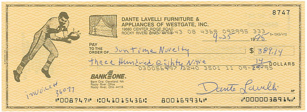 Two checks: a personal check filled out and signed by Hank Stram, June 9, 1990; and a Dante Lavelli Furniture & Appliances business check, filled out and signed by Lavelli, September 25, 1995. In very good condition, with tears and creases to Stram’s check.