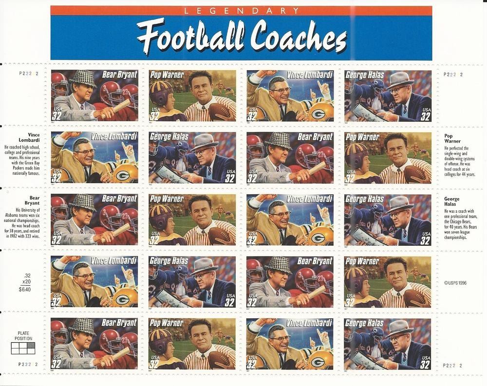 Legendary Football Coaches Sheet of Twenty 32 Cent Stamps Scott 3143 - 1997