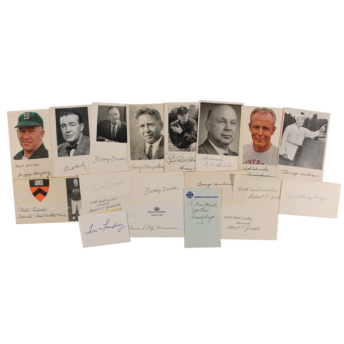 Twenty-one ink signatures of college football coaches on individual off-white cards and clipped slips, with some featuring clipped photos of the respective coach. Signers are: Robert C. Zuppke (3, one featuring a color sketch), Bobby Dodd (2), Frank Leahy, Earl Red Blaik, D. X. Bible, Charlie Caldwell, Bud Wilkinson, Woody Hayes (2), Duffy Daugherty, George Halas (2), Glenn S. ‘Pop’ Warner, Tom Landry, Paul E. Brown, De Ormond “Tuss” McLaughry, and Amos Alonzo Stagg (2). In fine condition, with scattered light toning.