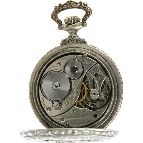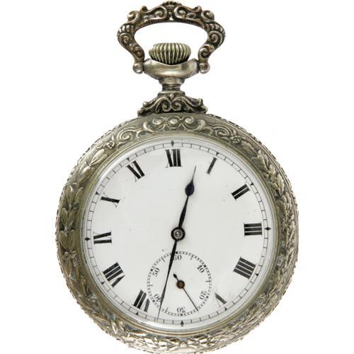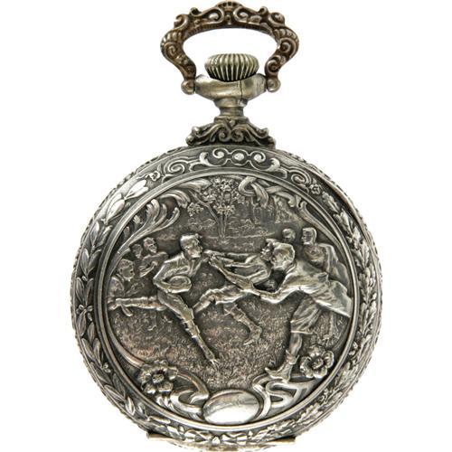 <B>"Football" Engraved Open Face Pocket Watch Circa 1900.</B></I> The football scene on the back of this 2" diameter watch is very similar to the one described in another lot. This one is accomplished with a much higher relief and more detail; eight young men are having a football game in the park. The ball carrier is straight-arming a defender as three others run toward him ready to make the tackle. It shows three of his teammates in the background which raises the question in this cataloguer's mind as to why they weren't blocking for him! The scene is surrounded by a decorative foliate border which is repeated on the front bezel. The back opens to an additional cover over the 7 jewel Swiss movement. The Roman-numeraled dial has no markings but features a sunken seconds dial at the 6:00 position. This watch is crown wound and set, is in excellent condition, and keeping time. A perfect item for the football fan and who isn't one of those?