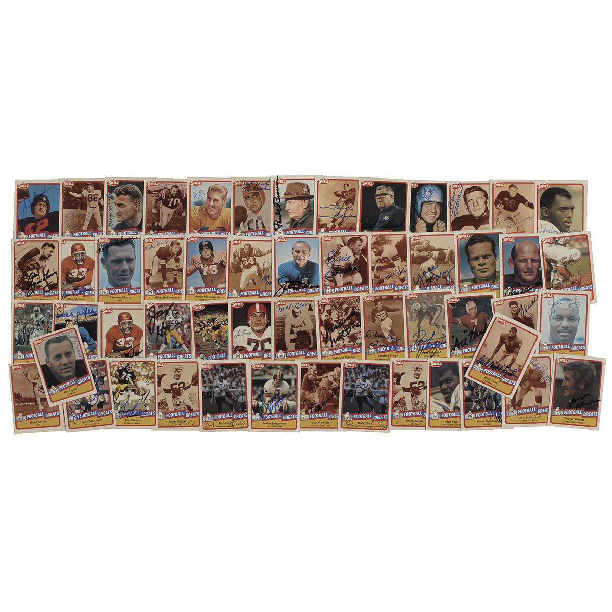 Fifty-four Swell Football Great trading cards from 1989, each signed on the front in ink or felt tip by the respective player pictured. Signers are: Sid Luckman, Dick ‘Night Train’ Lane, Dante Lavelli, Jim Taylor, George McAfee, Art Donovan, Elroy Hirsch, George Blanda, Otto Graham, Paul Brown, Don Hutson, Tom Fears, Andy Robustelli, Weeb Ewbank, Bill Dudley, Gino Marchetti, Chuck Bednarik, Clyde Turner, John Henry Johnson, Gene Upshaw, Joe Greene, Alan Page, Alex Wojciechowicz, Ollie Matson (2), Raymond Berry, Frank Gatski (2), Bob Lilly (2), Mike McCormack, Arnie Weinmeister, Joe Perry, Sid Gillman, Ernie Stautner, Bill Willis, Yale Lary, Steve Van Buren, Ray Nitschke, Jim Langer, Don Maynard, Doak Walker, Jack Ham, Willie Davis, Lou Groza, Mel Hein, Marion Motley, Charley Trippi, Paul Warfield, Clarence Parker, George Musso, Jim Parker, Joe Schmidt, and Sonny Jurgensen. In fine condition.