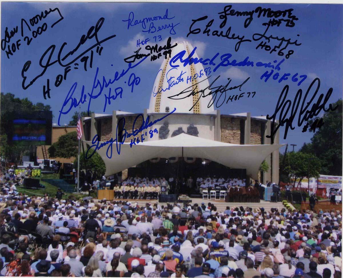 Spectacular glossy photo signed by 12 Hall of Fame players, taken at a dedication ceremony at the Pro Football Hall of Fame. Signatures include Dan Rooney, Earl Campbell, Bob Griese, Terry Bradshaw, Ray Berry, Tom Mack, Chuck Bednarik, Charley Trippi, Lenny Moore, Frank Gifford, Dan Fouts and Floyd Little, all of whom have written their HOF year. 10'' x 8'' glossy color photo is in near fine condition.