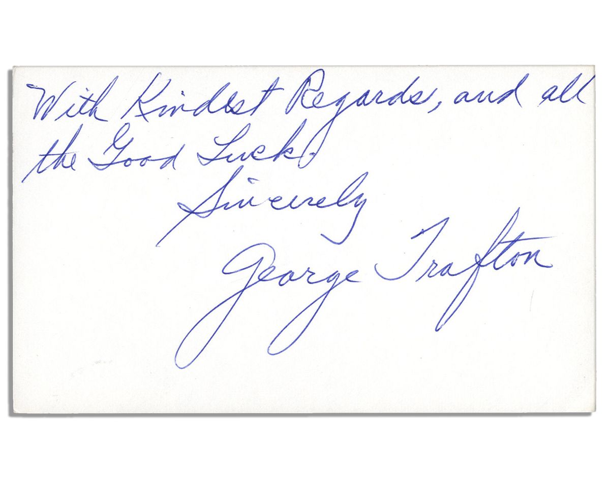 Football Hall of Famer George Trafton autograph salutation signed. Trafton writes in blue ink, ''With Kindest Regards, and all the Good Luck. Sincerely / George Trafton'' to a 5'' x 3'' blank card. Lot includes a printed, unsigned LOA from George Trafton. Near fine.