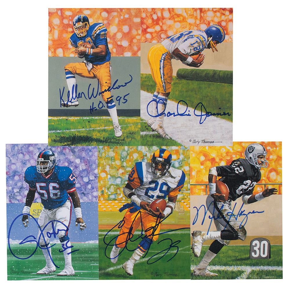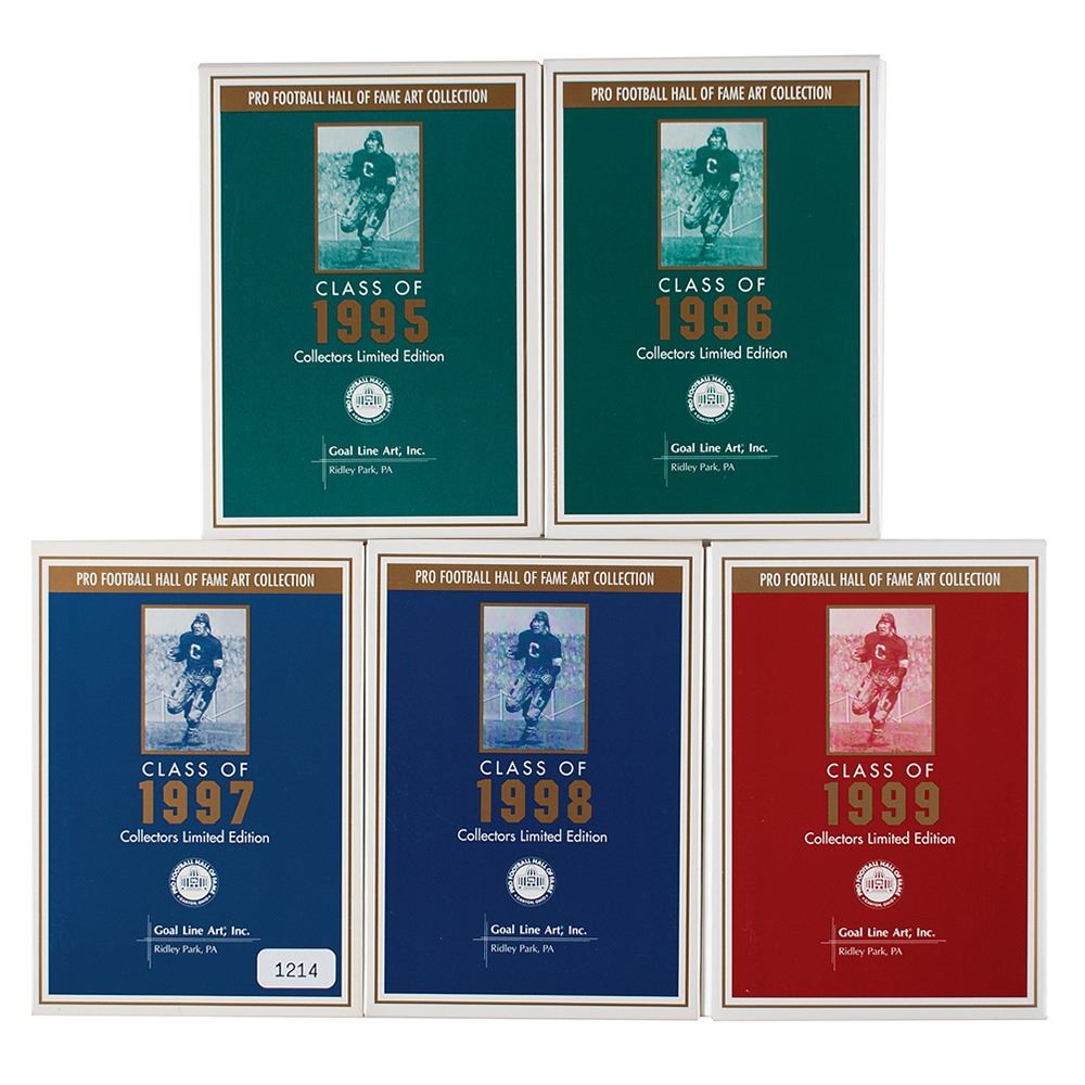 Five sets of Pro Football Hall of Fame Art Series cards made by Goal Line Art, Inc., honoring the HOF classes of 1995 through 1999, with a total of 18 signed cards.