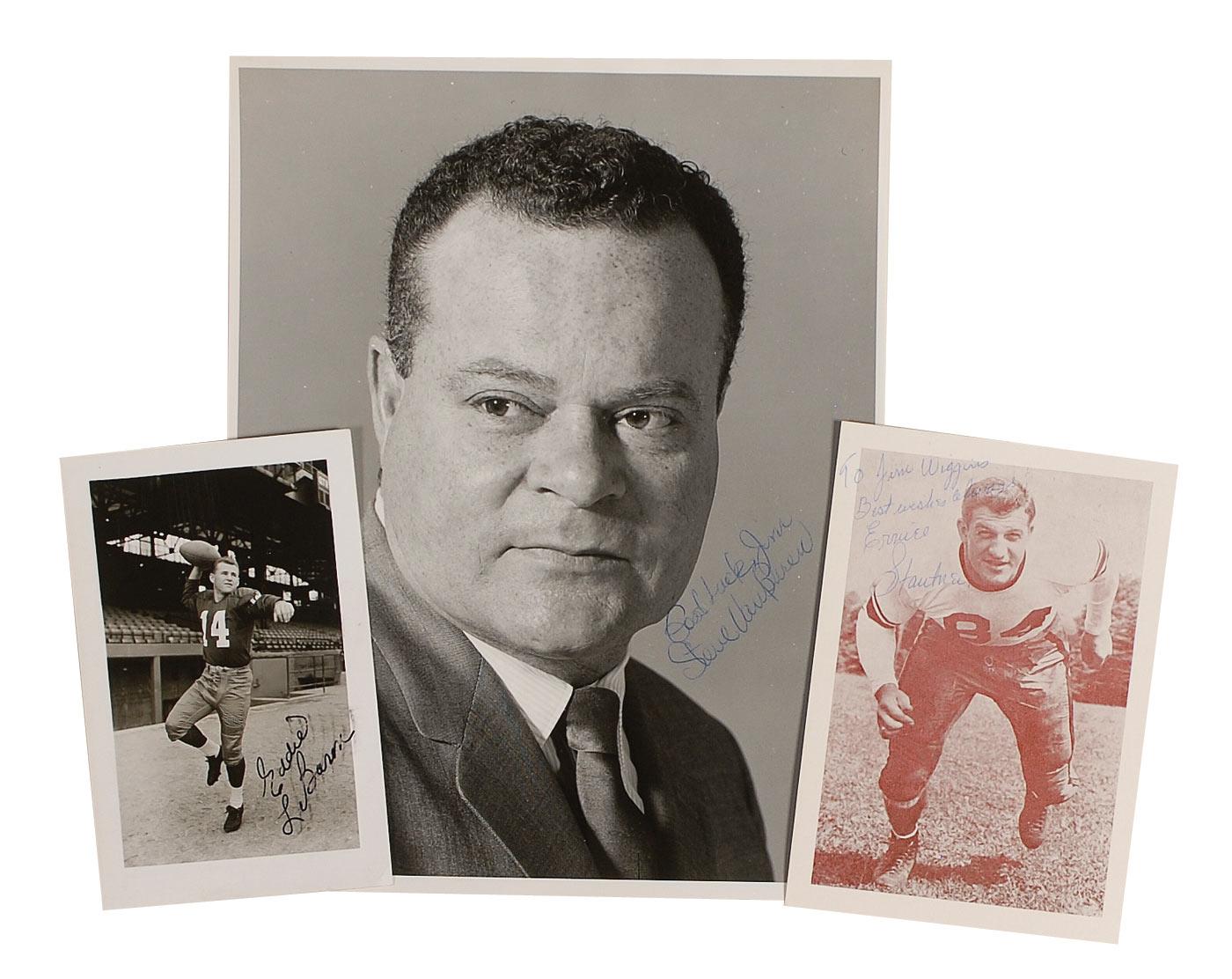Three items: cardstock 4 x 5.75 photo signed and inscribed in blue ballpoint by Ernie Stautner; glossy 3.5 x 5.5 postcard photo signed in black ink by Eddie LeBaron; and a glossy 8 x 10 photo signed and inscribed in blue ballpoint by Steve Van Buren. In overall very good to fine condition.