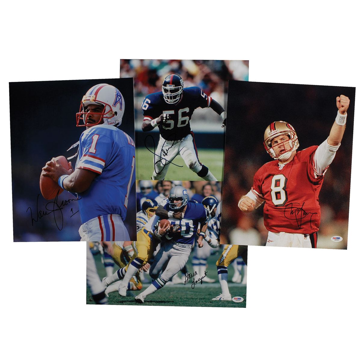 Four color glossy and satin-finish 11 x 14 photos, each signed by the respective Hall of Famer pictured. Signers are: Steve Young, Steve Largent, Lawrence Taylor, and Warren Moon. In fine condition. Two of the photos are accompanied by a certificate of authenticity from PSA/DNA.