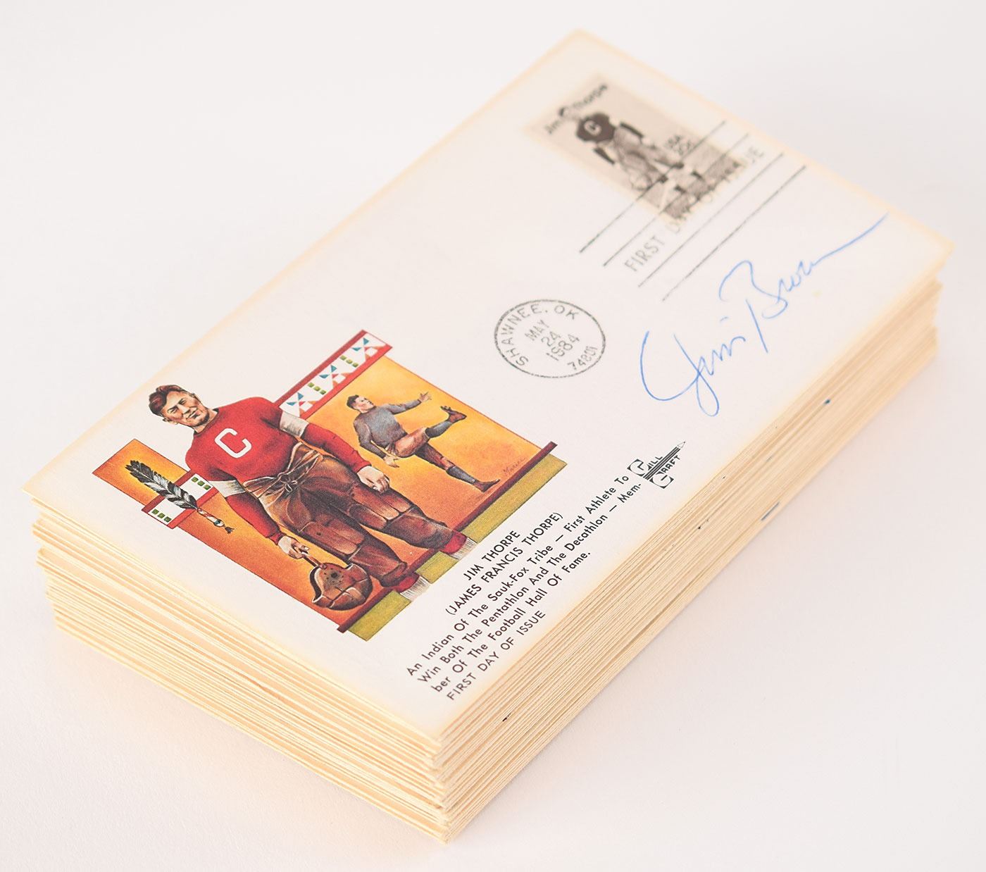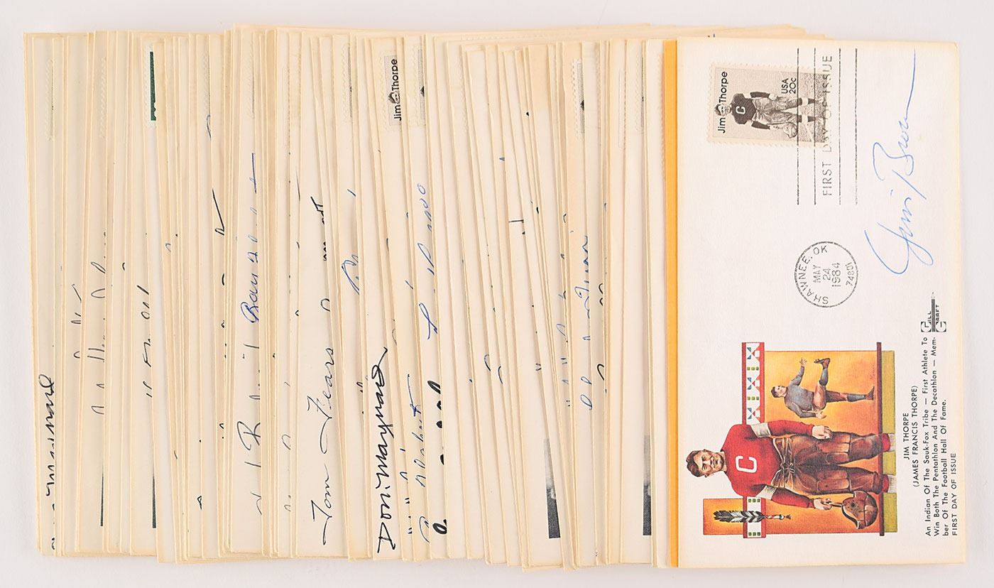Collection of 66 FDCs with cachets honoring football, individually signed in ink by legends of the sport, including 60 multi-signed covers which include names such as Jim Brown, Ray Flaherty, Sid Luckman, Bill Dudley, Frank Gatski, Mel Hein, Yale Lary, Chuck Bednarik, Sam Huff, Ace Parker, Don Hutson, Elroy 'Crazylegs' Hirsch, Joe Schmidt, Jack Ham, Doug Atkins, Weeb Ewbank, Arnie Weinmeister, Sid Gillman, Charley Trippi, Morris 'Red' Badgro, Leo Nomellini, Bob Lilly, Alex Wojciechowicz, Dick 'Night Train' Lane, Ollie Matson, Jim Otto, Andy Robustelli, Sonny Jurgensen, Ray Nitschke, Rosey Brown, Tom Fears, Bobby Mitchell, Dick Butkus, George McAfee, Don Maynard, Lenny Moore, Walter Payton, Doak Walker, Hugh McElhenny, Frank Gifford, John Henry Johnson, and Art Donovan (most of whom sign several times). Six covers are individually signed by Jim Brown (2), Art Rooney, Tony Canadeo, Alex Agase, and Earl 'Red' Blaik. In overall fine condition.