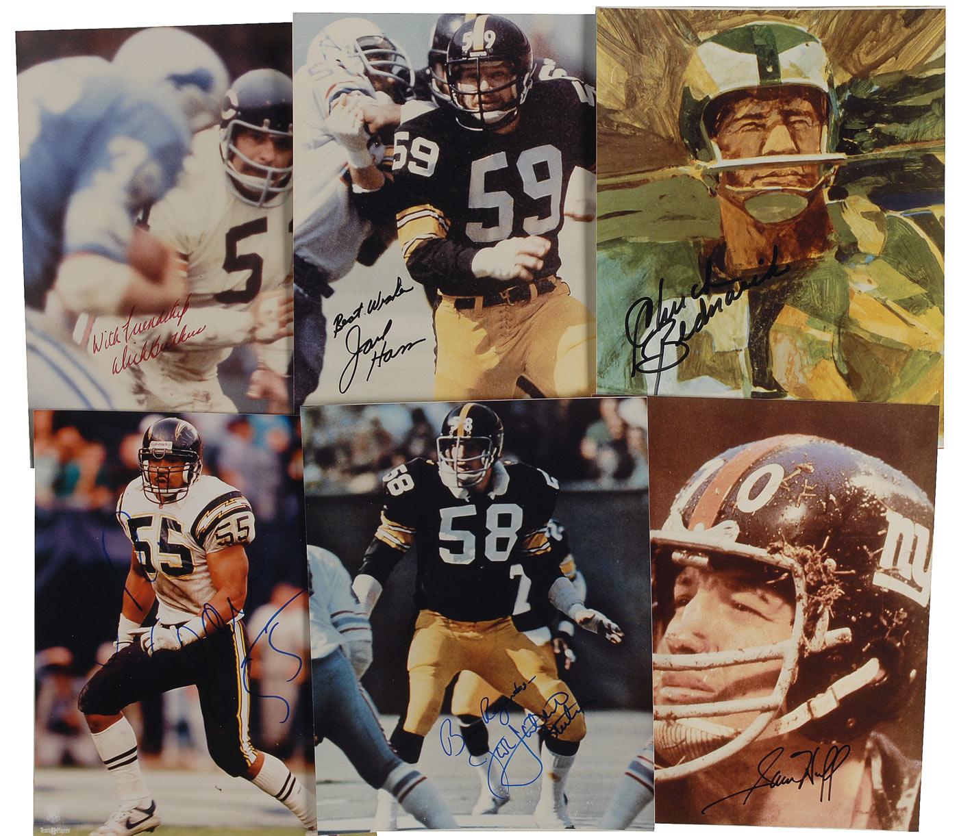 Six color glossy 8 x 10 photos of NFL linebacker legends, individually signed in blue, black, or red felt tip by Chuck Bednarik, Dick Butkus (adding “With friendship”), Jack Ham (”Best Wishes”), Sam Huff, Jack Lambert (adding “Best Regards” and “Steelers”), and Junior Seau (adding “55”). In overall fine condition.