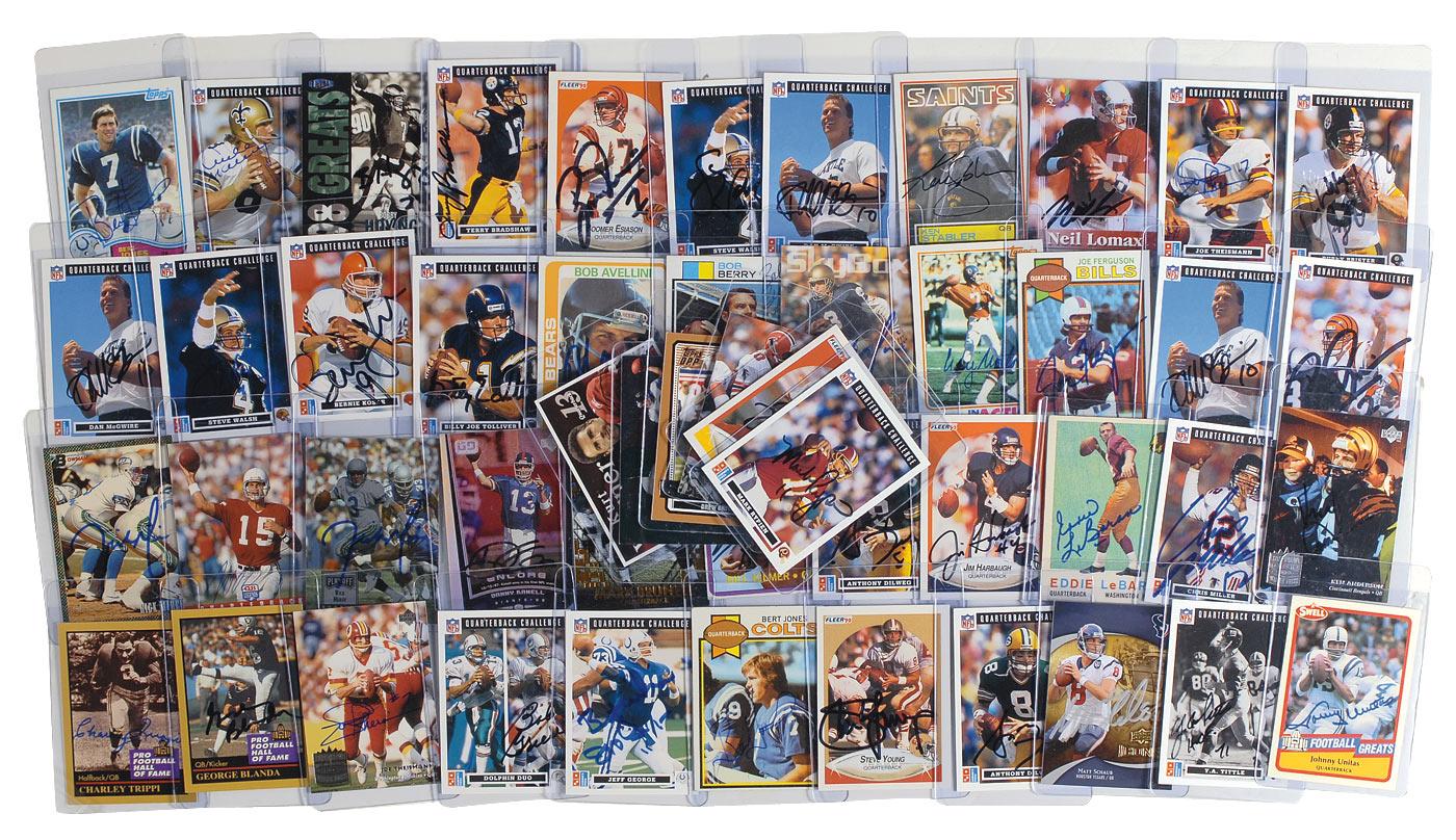 Fifty football trading cards, each individually front-signed in ink by its respective subject, with some duplication of names. Signers include: George Blanda, Johnny Unitas, Drew Brees, Terry Bradshaw, Steve Young, Archie Manning, Billy Kilmer, Y. A. Tittle, Ken Stabler, Joe Theisman, Dan Fouts, Bob Griese, Boomer Esiason, Bubby Brister, Kurt Warner, Charley Trippi, Jim Zorn, Neil Lomax, Steve Deberg, Mark Rypien, Ken Anderson, Jeff George, Bert Jones, Steve Bartkowski, Matt Schaub, Anthony Dilweg, Mark Brunell, and Eddie LeBaron. In fine condition, with some cards showing irregular ink adhesion due to the surface gloss.