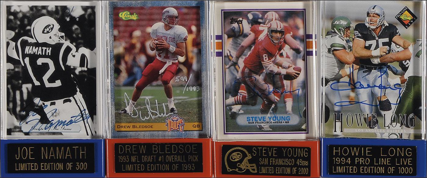 Four limited edition color football trading cards, each front-signed in blue or silver ink by its respective quarterback subject. Signers are Joe Namath (numbered “73/300”), Howie Long (”452/1000”), Drew Beldsoe (”599/1993”), and Steve Young (”317/2000”). Each is removably encased in a plastic holder. In overall fine condition.
