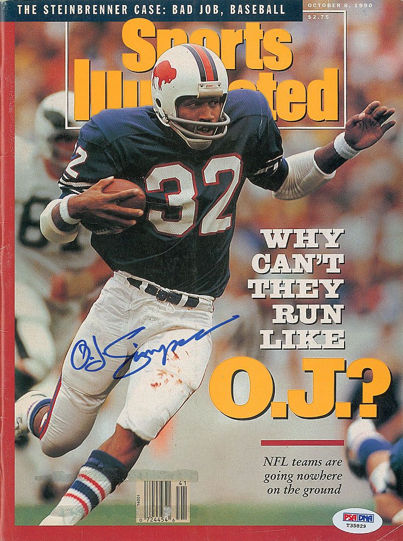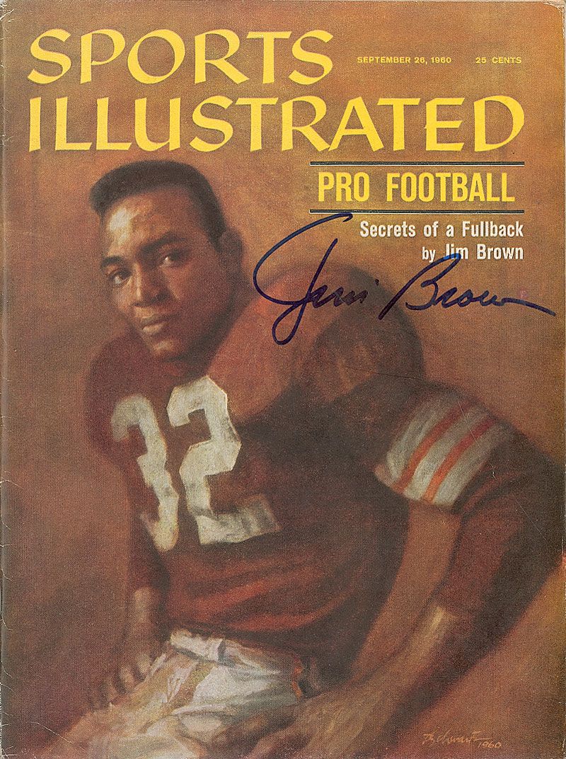 Two issues of Sports Illustrated, each signed by the running back pictured: one featuring Jim Brown on the cover, dated September 26, 1960, signed in blue felt tip; and one featuring O. J. Simpson on the cover, dated October 8, 1990, signed in blue felt tip. In overall fine condition.
