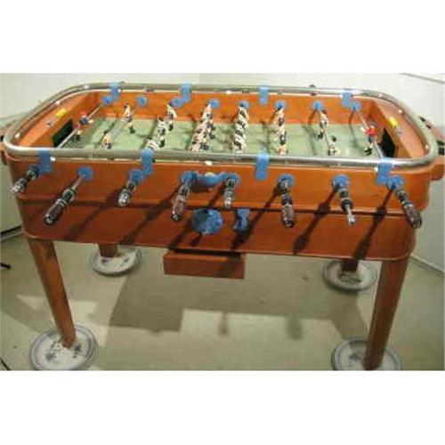 Totally Restored. More pictures available. A coin is inserted to release the original 6 wooden balls into the drawer that sits below the surface. When a goal is scored the ball drops down into a "holding" place until a coin releases them to the drawer again. The men are metal all the side handles are bakelite Made and marked in three places "Mancebos, Logar, Madrid". There are yellow scoring rings on each end. It is standing on four plates to protect the ends of the legs. Would need to be crated for shipping. Pick up OK.