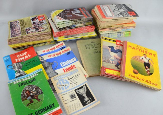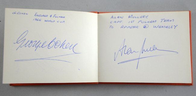 Football: an autograph book signed by George Cohen (England), Alan Mullery, Jimmy Conway (Fulham), some cricket autographs including Jim Laker, a large quantity of Fulham FC prgrammes from 1959-90's, England v West Germany, 1972, Manchester City v Chelsea European Cup 1971, Chelsea v Stoke City 1972 League Cup Final, Chelsea v Leeds united FA Cup Final 1970 & others, also 10 Football annual from the 1940's-70's & some World Cup Engladn Winners stamps