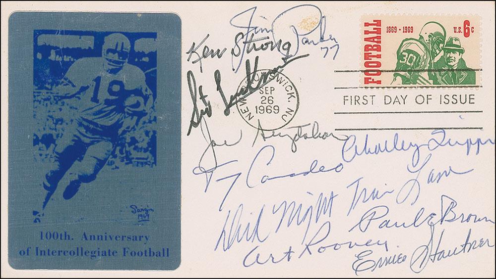 FDC honoring the 100th anniversary of intercollegiate football, signed in blue or black ink by ten stars: Joe Stydahar, Ken Strong, Art Rooney, Jim Parker, Paul E. Brown, Ernie Stautner, Dick ‘Night Train’ Lane, Tony Canadeo, and Charley Trippi. FDC also bears a secretarial signature of Sid Luckman. A few spots of soiling, otherwise fine condition.