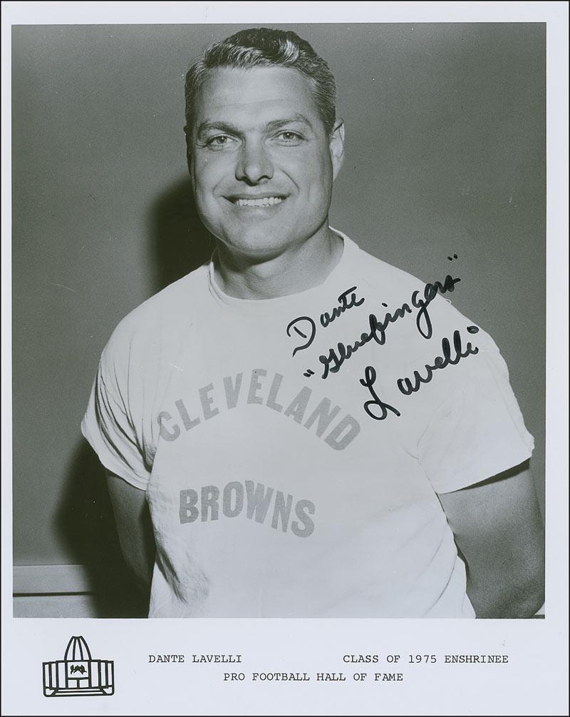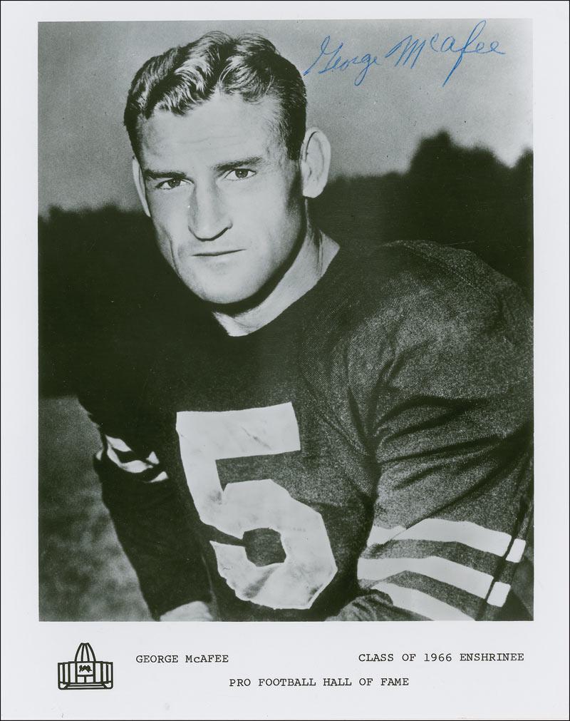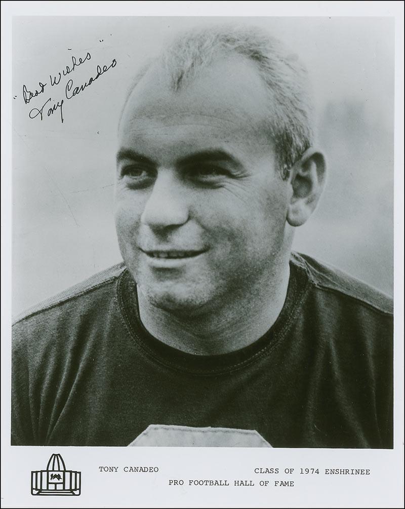 Three glossy 8 x 10 Hall of Fame enshrinement photos, each signed in ballpoint or felt tip by the respective Hall of Famer pictured. Signers are: George McAfee, Dante ‘Gluefingers’ Lavelli, and Tony Canadeo. In fine condition.
