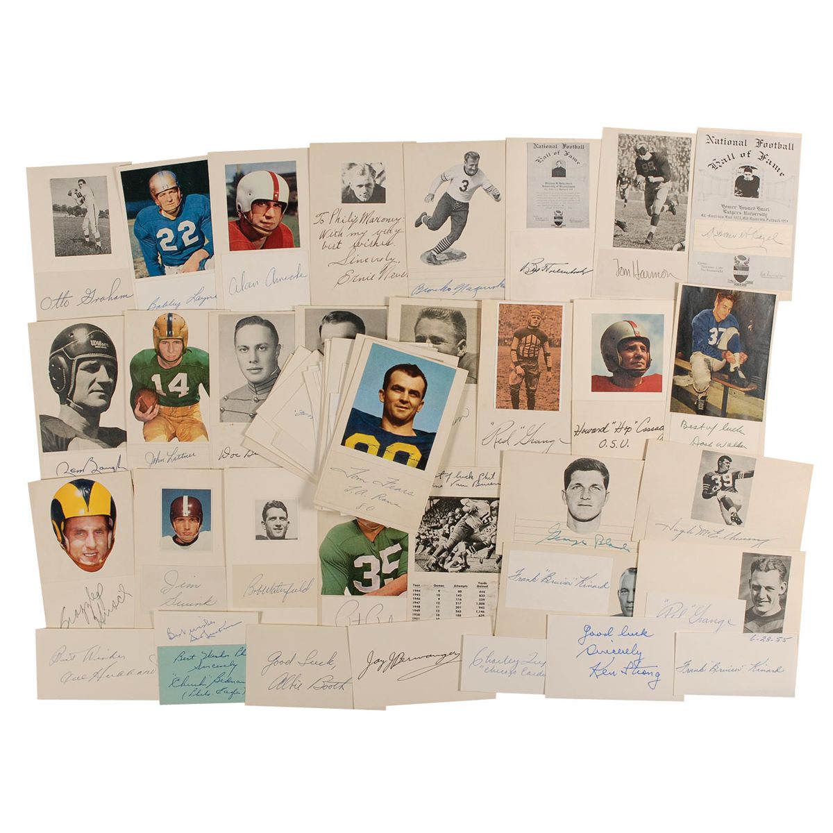 Fifty-eight ink signatures of football greats on individual off-white cards, ranging in size from 2.75 x 1.25 to 5 x 3, some affixed to a larger card with a clipped photo of the respective athlete. Signers are: Albie Booth (3), Doc Blanchard, Don Meredith, Johnny Lujack, Glenn Davis, John Lattner, Paul Hornung, Doak Walker, Chuck Bednarik, Jay J. Berwanger, Howard ‘Hop’ Cassady, Alan Ameche, Bobby Layne, Otto Graham (2), Billy Cannon, Mel Hein (2), ‘Bulldog’ Turner (2), Frank ‘Bruiser’ Kinard (2), Bill Hollenback, Tom Harmon, Homer H. Hazel, Sam Baugh, Bronko Nagurski (2), Ernie Nevers (2, one ins), ‘Red’ Grange (2), Don Hutson, Ken Strong, Charley Trippi, Hugh McElhenny, Jack Christiansen, Clarence ‘Ace’ Parker, Ernie Stautner, Raymond Berry, Ollie Matson, Tom Fears, Lou Groza, Dante Lavelli, Sid Luckman (2), Bart Starr, Jim Finks, Steve Van Buren, George Blanda, Cal Hubbard, Pete Pihos, Jim Swink, Bob Waterfield, Crazylegs Hirsch, and Emlen Turrell. In fine condition, with scattered light toning and soiling, and some trimmed edges.