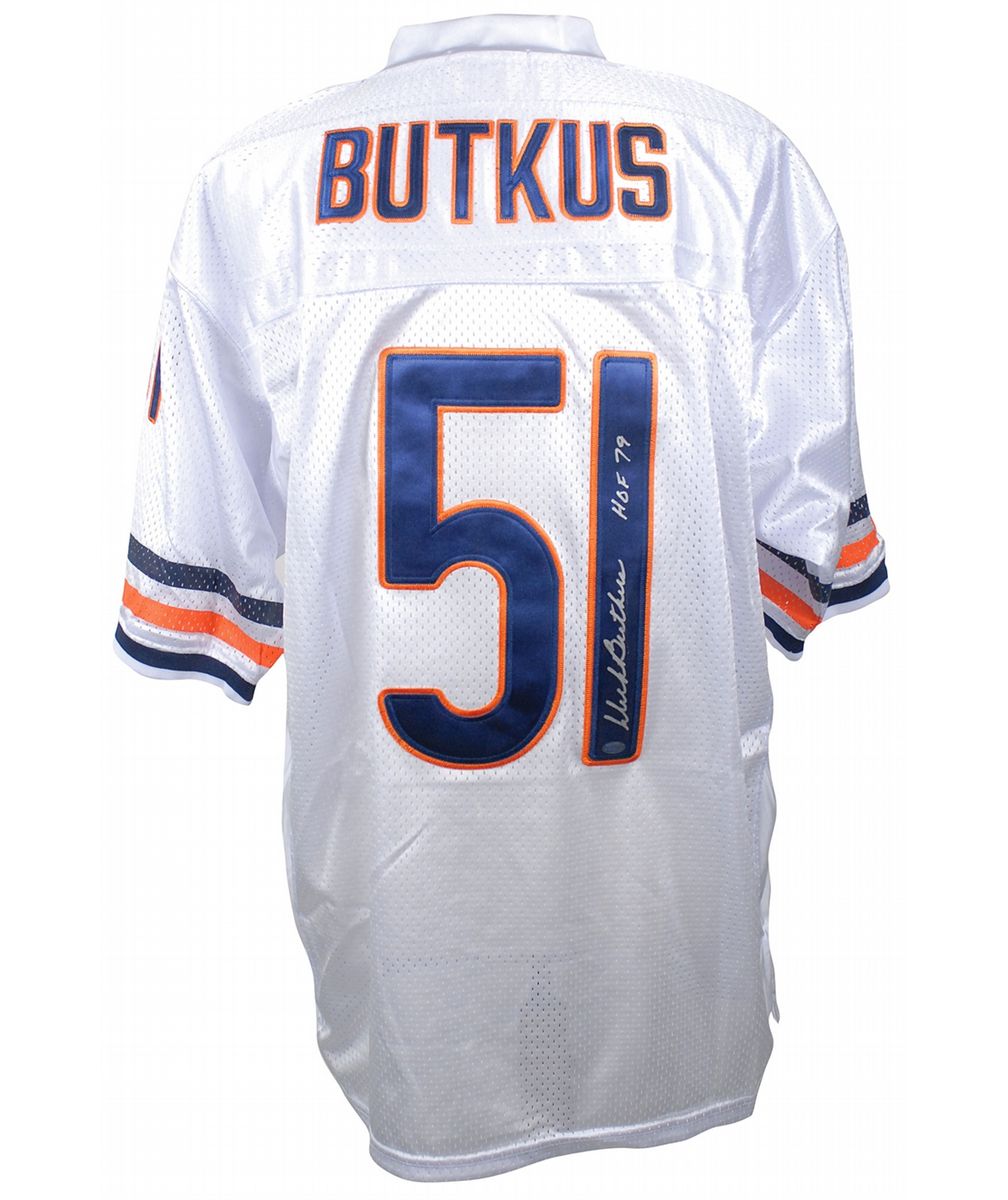 Collection of nine replica football jerseys, with sewn on letters and numbers, each signed on the number on the back in felt tip or ink by a major football star, including: Terry Bradshaw, Dick Butkus, Eric Dickerson, John Elway, Doug Flutie, Joe Montana, Emmitt Smith, Bart Starr, and LaDainian Tomlinson. In overall fine condition.