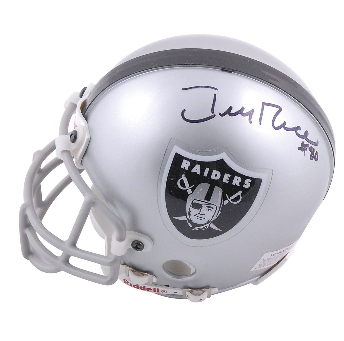 Four items: Russell Athletic UCLA football jersey, signed on the number on the back in silver ink by Troy Aikman; Xavier Proline replica San Diego Chargers jersey, signed on the number on the back in black felt tip by Dan Fouts; team-issued Kansas City Chiefs jersey, signed and inscribed on the back in black felt tip by Derrick Thomas; and an Oakland Raiders mini football helmet, signed on the side in black felt tip by Jerry Rice. In fine condition.
