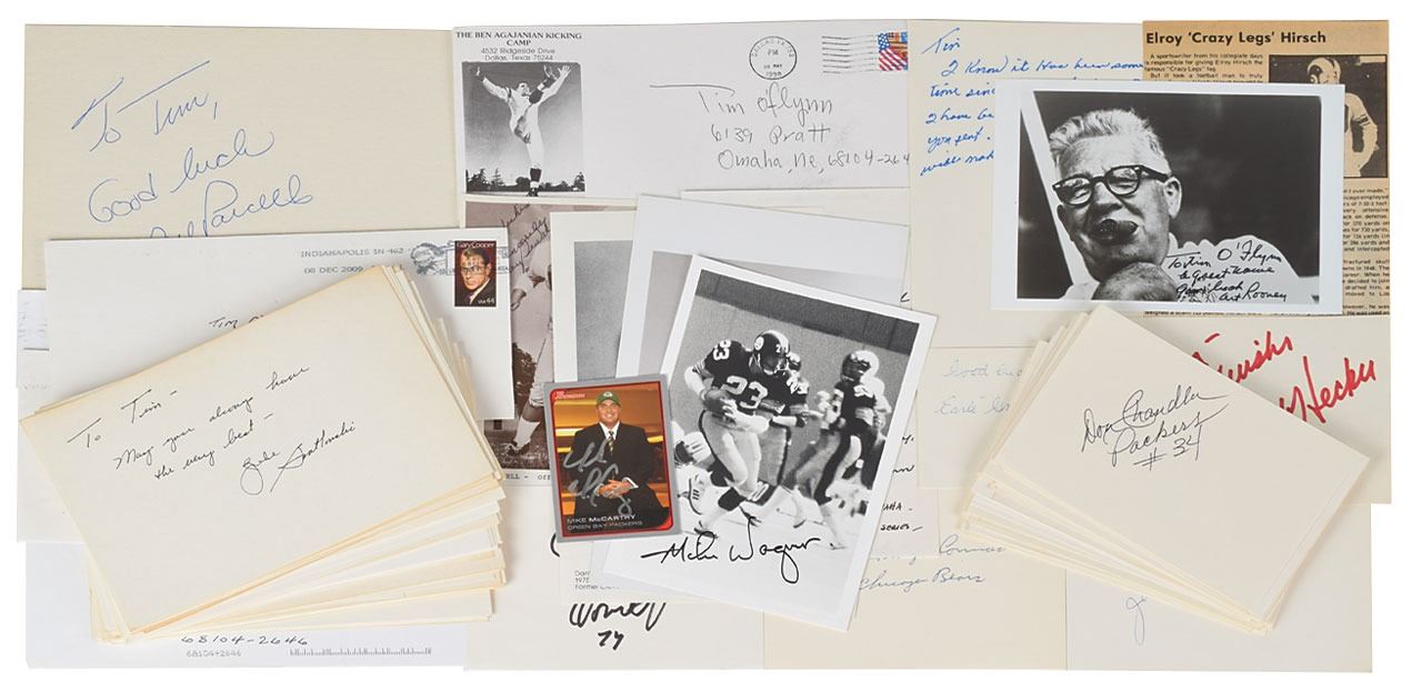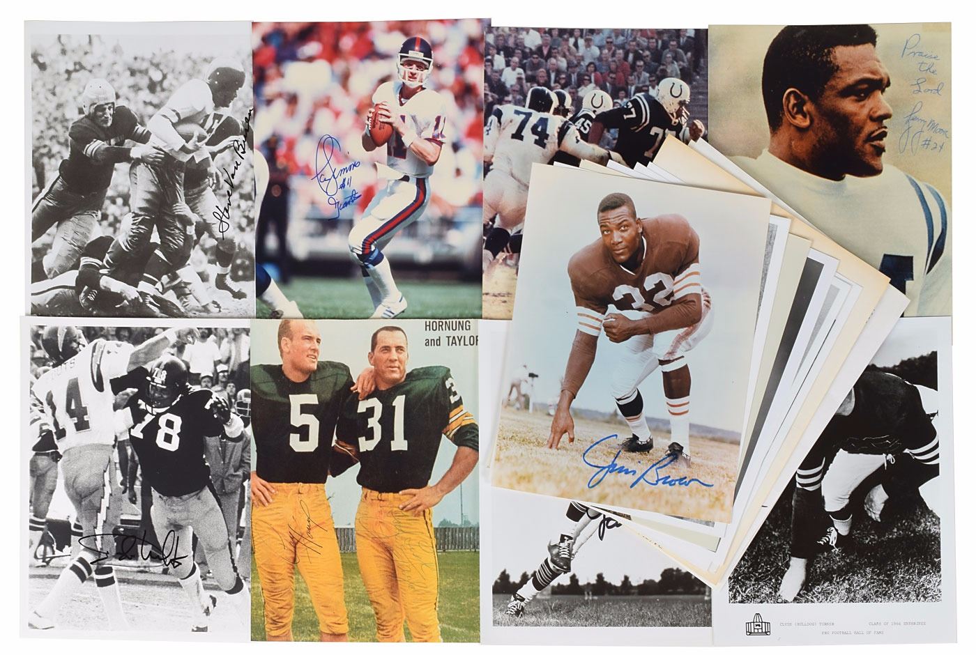 Collection of more than 150 items signed by various legends of the gridiron, consisting mostly of signed photos and signatures on off-white 8 x 5 cards, with some inscribed. Players and coaches include: Doug Atkins, Jerry Attaway, Vince Banonis, Chuck Bednarik (2), Raymond Berry, Zeke Bratkowski, Jim Brown, Paul E. Brown, Ray Brown, Jim Caldwell, Tony Canadeo, Lew Carpenter, Don Chandler, George Connor (3), Roger Craig, Glenn Davis, Willie Davis (2), Mike Ditka, Art Donovan, Fred Dryer, Bill Dudley, Tony Dungy, Tom Fears, Jack Ferrante, Marv Fleming, Dan Fortmann (2), Bob Gain (2), Frank Gifford, Gale Gillingham, Sid Gillman, Bruce Gossett, Otto Graham (2), Joe Greene, Rosey Grier, Lou Groza (2), Paul Hackett, Gene Hickerson, Elroy Hirsch, Dick Hoak, Mike Holmgren, Paul Hornung and Jim Taylor, Tommy James, Deacon Jones, Ron Kramer, Dick ‘Night Train’ Lane, Gary Larsen, Dante Lavelli (2), Gino Marchetti, Mike McCarthy, Mike McCormack, Dick Maegle (3), Ron McDole, Bill McPherson, Joe Montana, Lenny Moore, Marion Motley, George Musso (2), Andy Nelson, Ray Nitschke (2), Buzz Nutter, Merlin Olsen, Bill Parcells, Jim Parker, Walter Payton, George Preas, Art Rooney (2), Buddy Ryan, Gale Sayers, Phil Simms, Bob Skoronski, Bart Starr, Lynn Stiles, Dan Towler (2), Charlie Trippi, Bob Tucker, Clyde Turner, Johnny Unitas, Steve Van Buren, Rick Volk, Bobby Walden, Bill Walsh, Jim Weatherwax, Mike Webster, John Wooten, and Frank Youso. In overall fine condition.