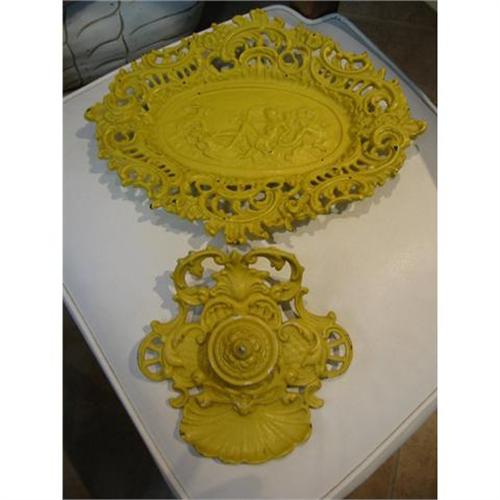 stunning set of cast iron painted with yellow color victorian-rococco style inkwell and tray. the set is old with few imperfections and wears. tray is 12" W., and is footed w decoration of three women in different poitions. the inkwell is lidded, and the insert is and 1/2 size of tray. 6.5"W. X 3" T. and they both footed. rococco style./shell. both numbered on the base reads, IRON ART LB 59 and on the inkwell reads: M 18B.