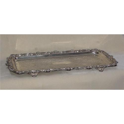 A silver plated tray, 21 1/4" X 10 3/4" with applied border and feet. Great for a bar to use to hold an ice budket and use as a mixing station or just to hold some beautiful decanters. Condition is very good could use a good polishing.